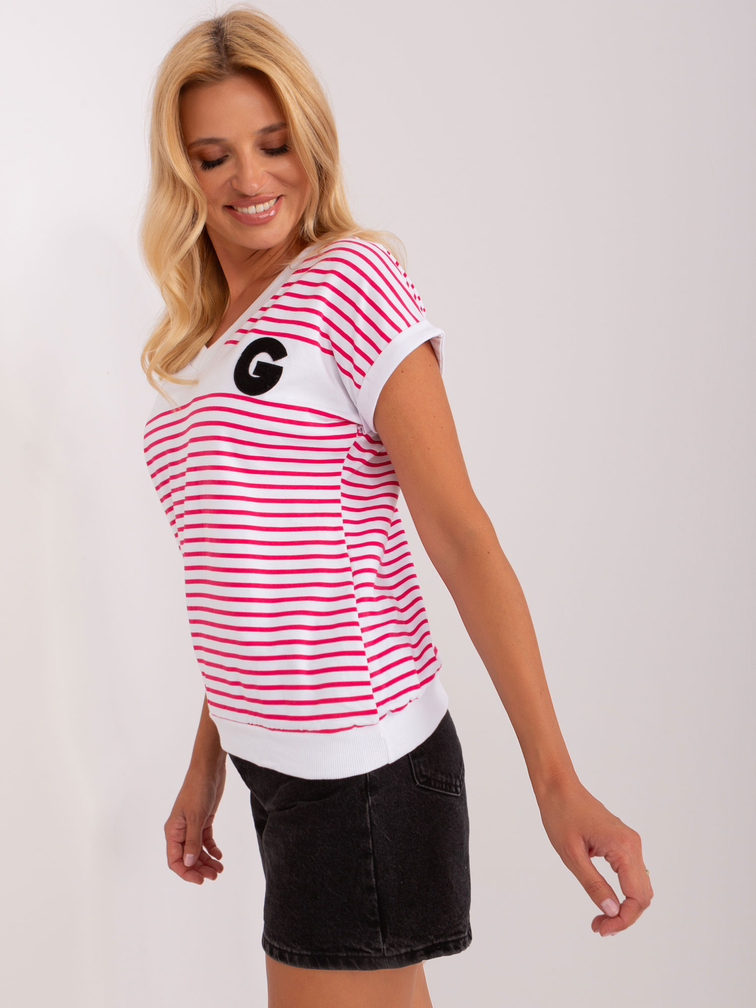 Wymiary bluzki w rozmiarze S mierzone na płasko: szerokość pod pachami – 50 cm, długość całkowita – 65 cm, długość rękawa – 41 cm.