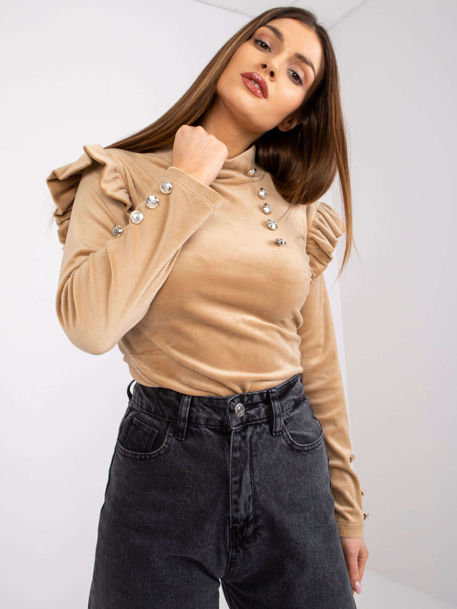 Wymiary bluzki w rozmiarze one size mierzone na płasko: szerokość pod pachami – 61 cm, długość całkowita – 65 cm.