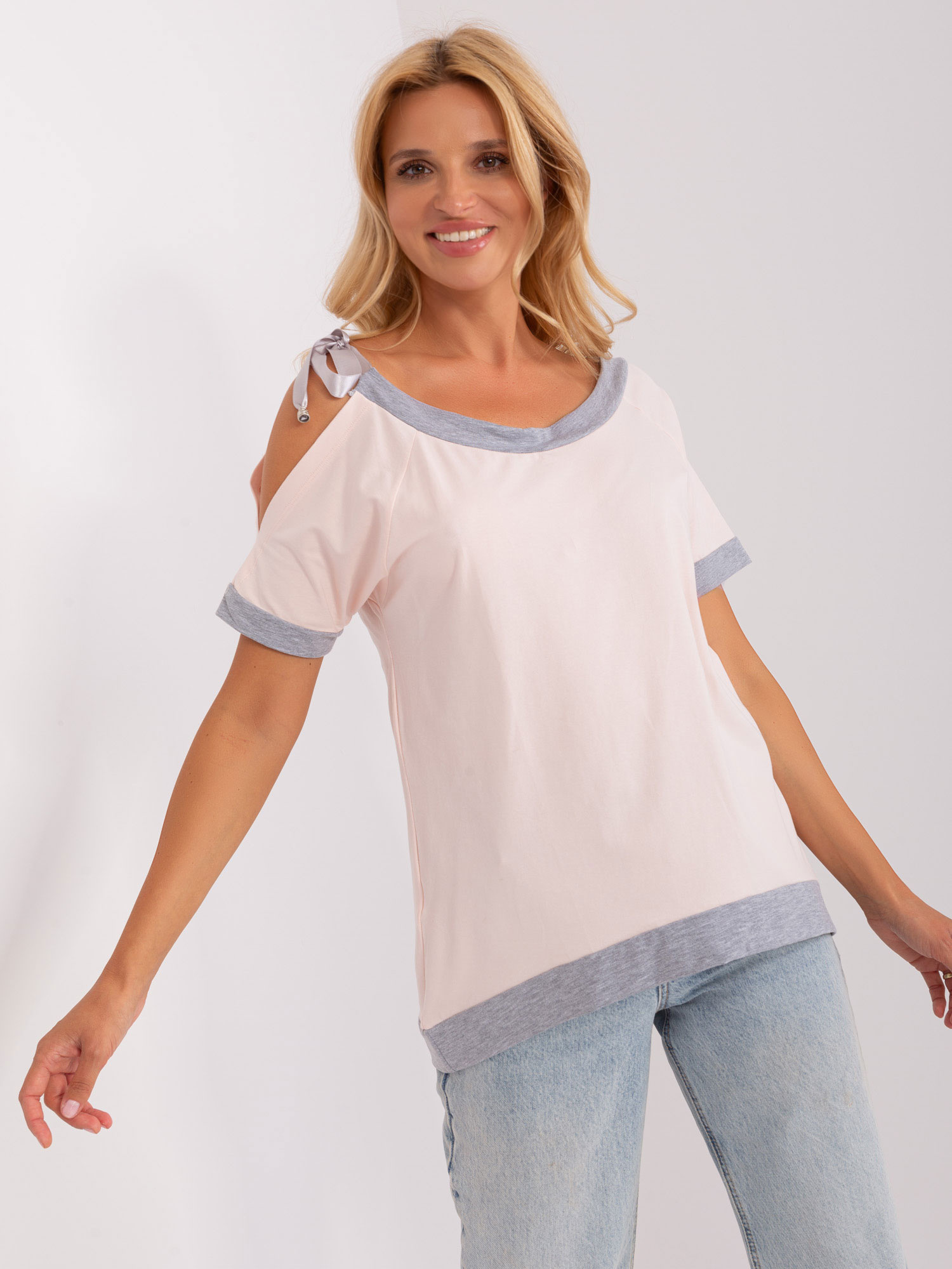 Wymiary bluzy w rozmiarze one size mierzone na płasko: szerokość pod pachami – 63 cm, długość rękawa – 58 cm, długość całkowita – 62 cm.