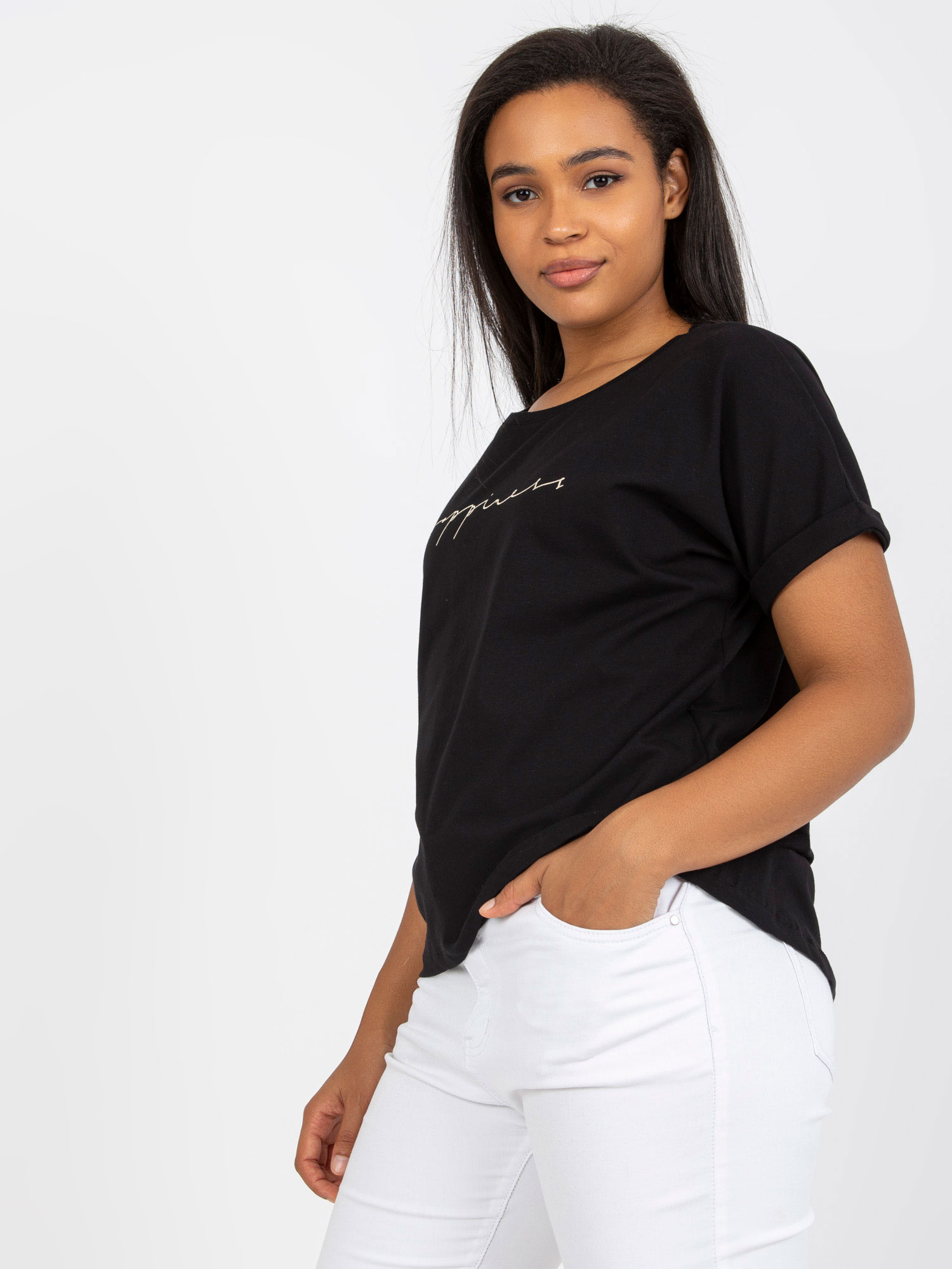 Wymiary bluzki w rozmiarze one size mierzone na płasko: szerokość pod pachami – 80 cm, długość całkowita – 72 cm.