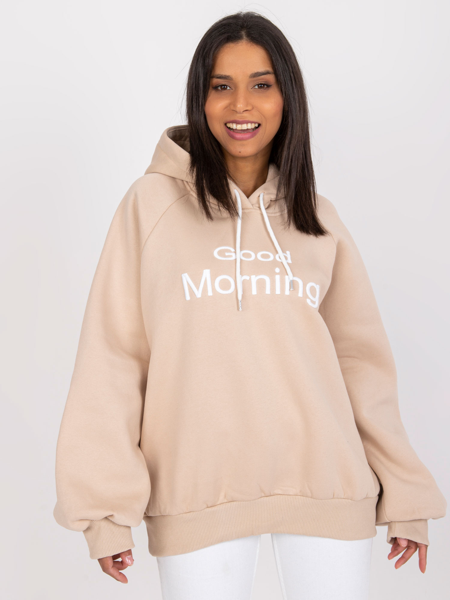 Wymiary bluzy w rozmiarze one size mierzone na płasko: szerokość pod pachami – 62 cm, długość całkowita – 67 cm, długość rękawa – 67 cm.