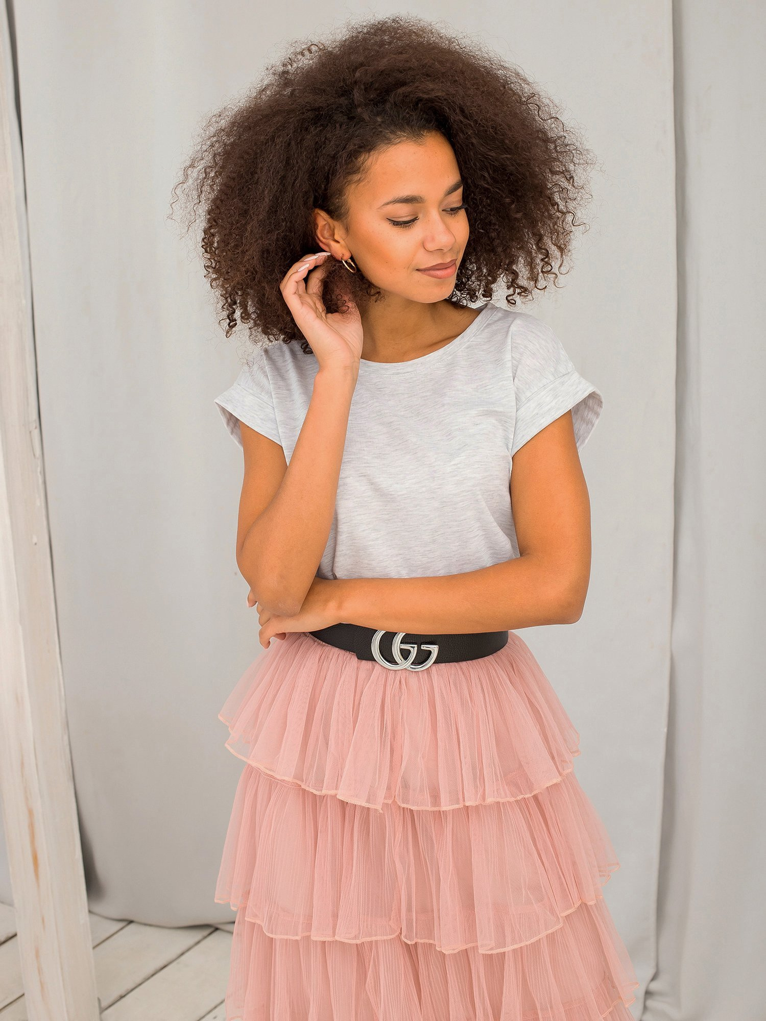 - Modelka: Modelka ma na sobie rozmiar one size. Wymiary modelki: wzrost 174 cm, biust 100 cm, talia 74 cm, biodra 107 cm