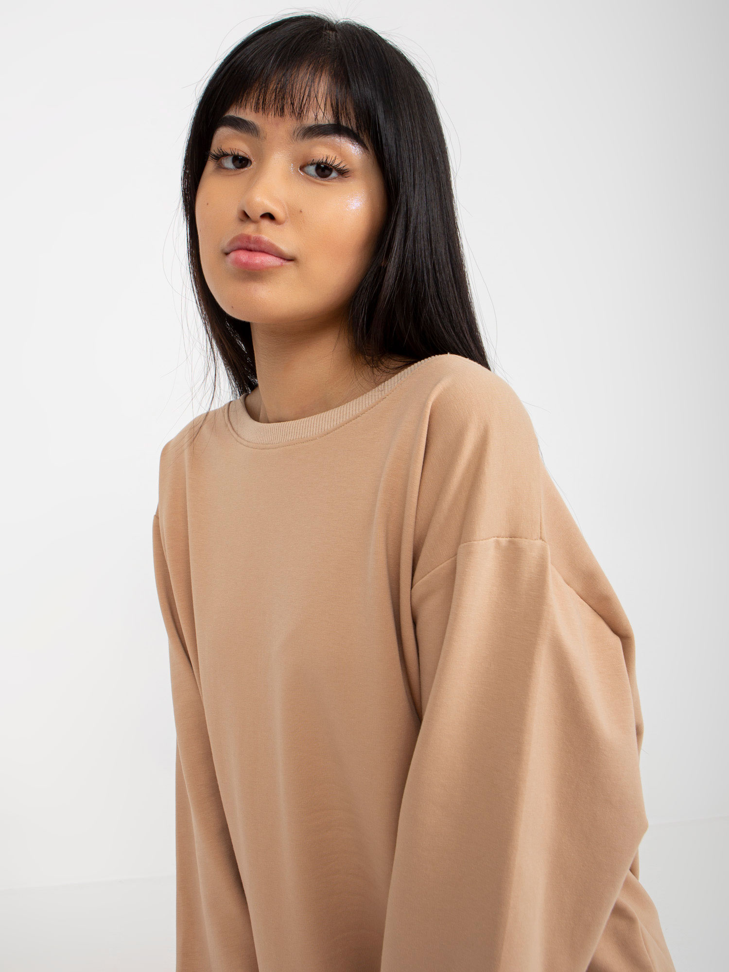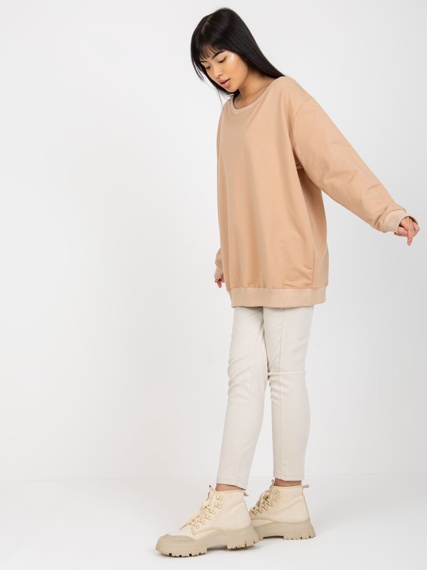 Beżowa luźna bluza bez kaptura z okrągłym dekoltem .