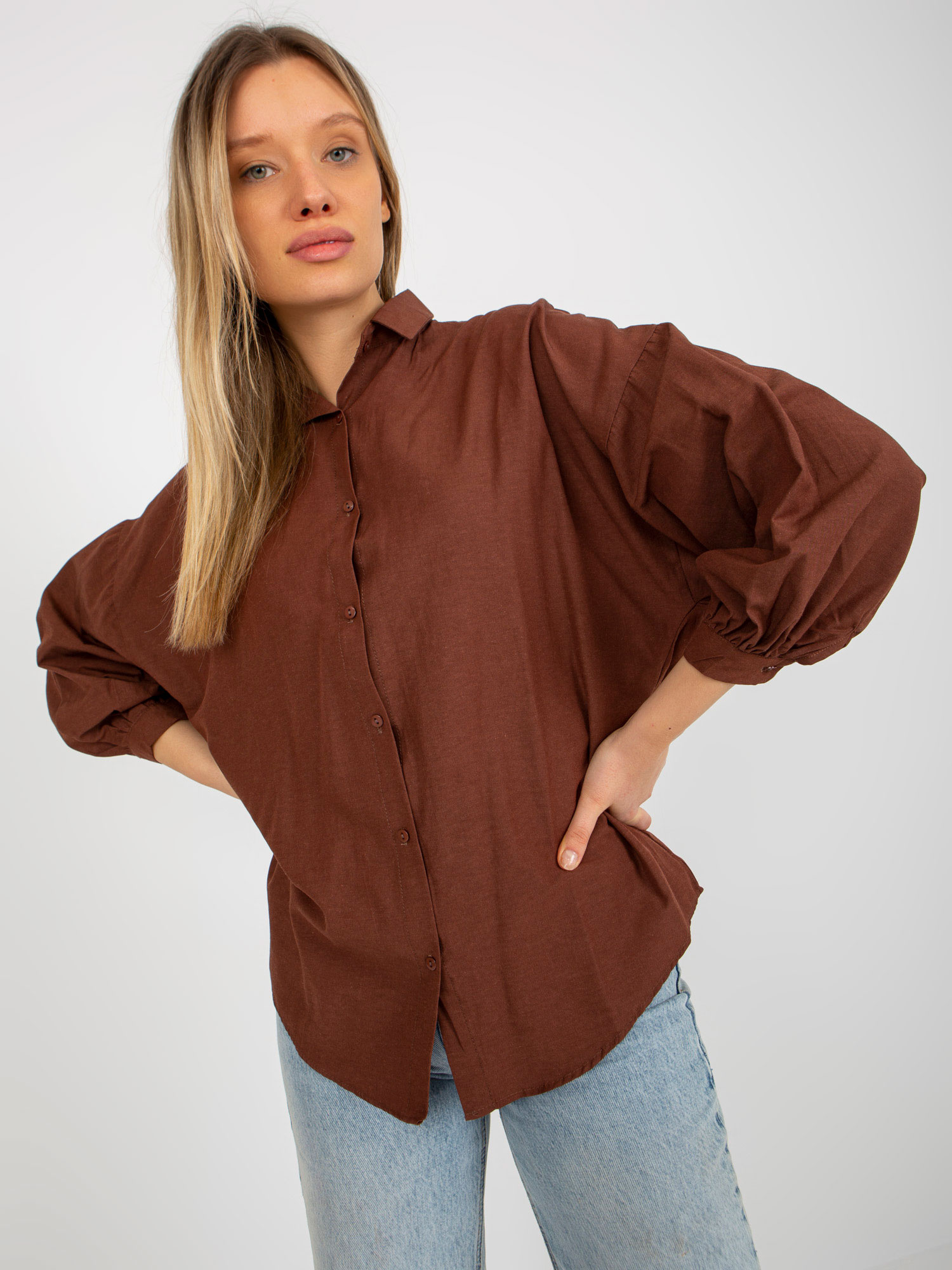 Wymiary bluzy w rozmiarze one size mierzone na płasko: szerokość pod pachami – 69 cm, długość całkowita – 104 cm, długość rękawa – 65 cm