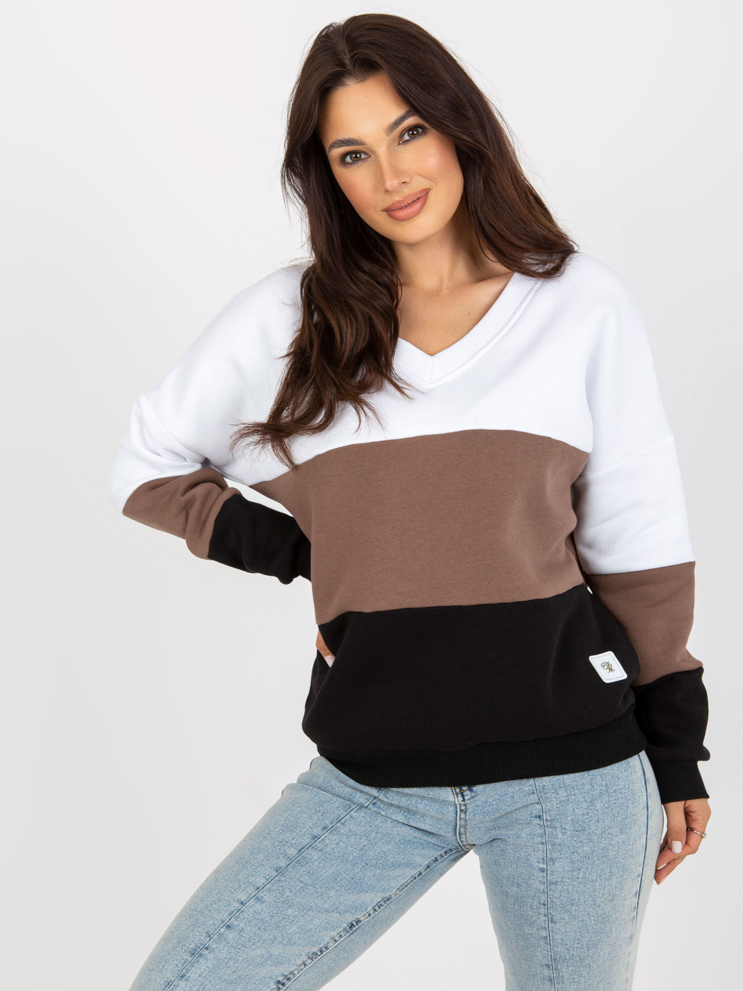 Biało-brązowa dresowa bluza basic z dekoltem V .