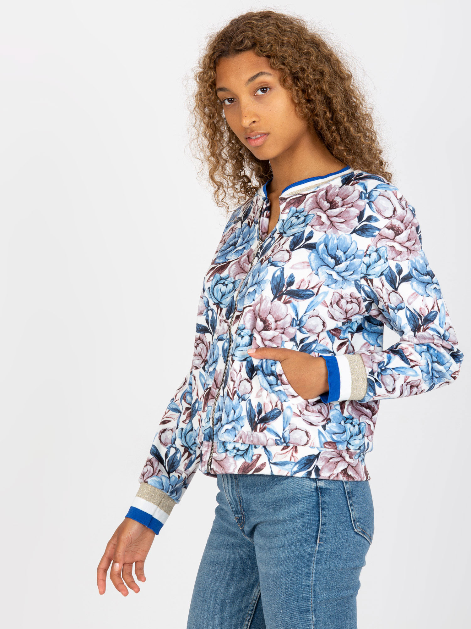Biało-niebieska welurowa bluza bomberka w kwiaty RUE PARIS .