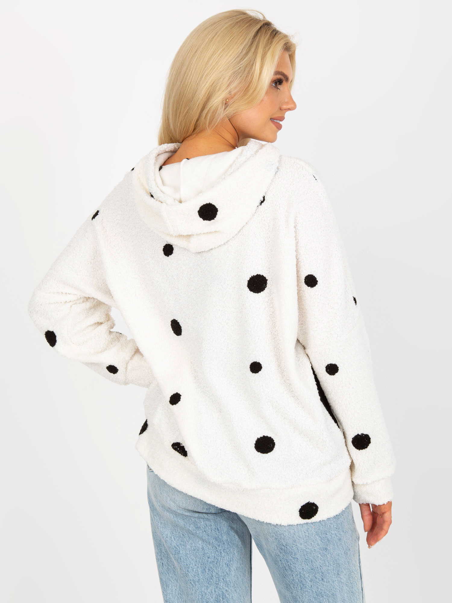 Biała futrzana bluza w grochy z kapturem .