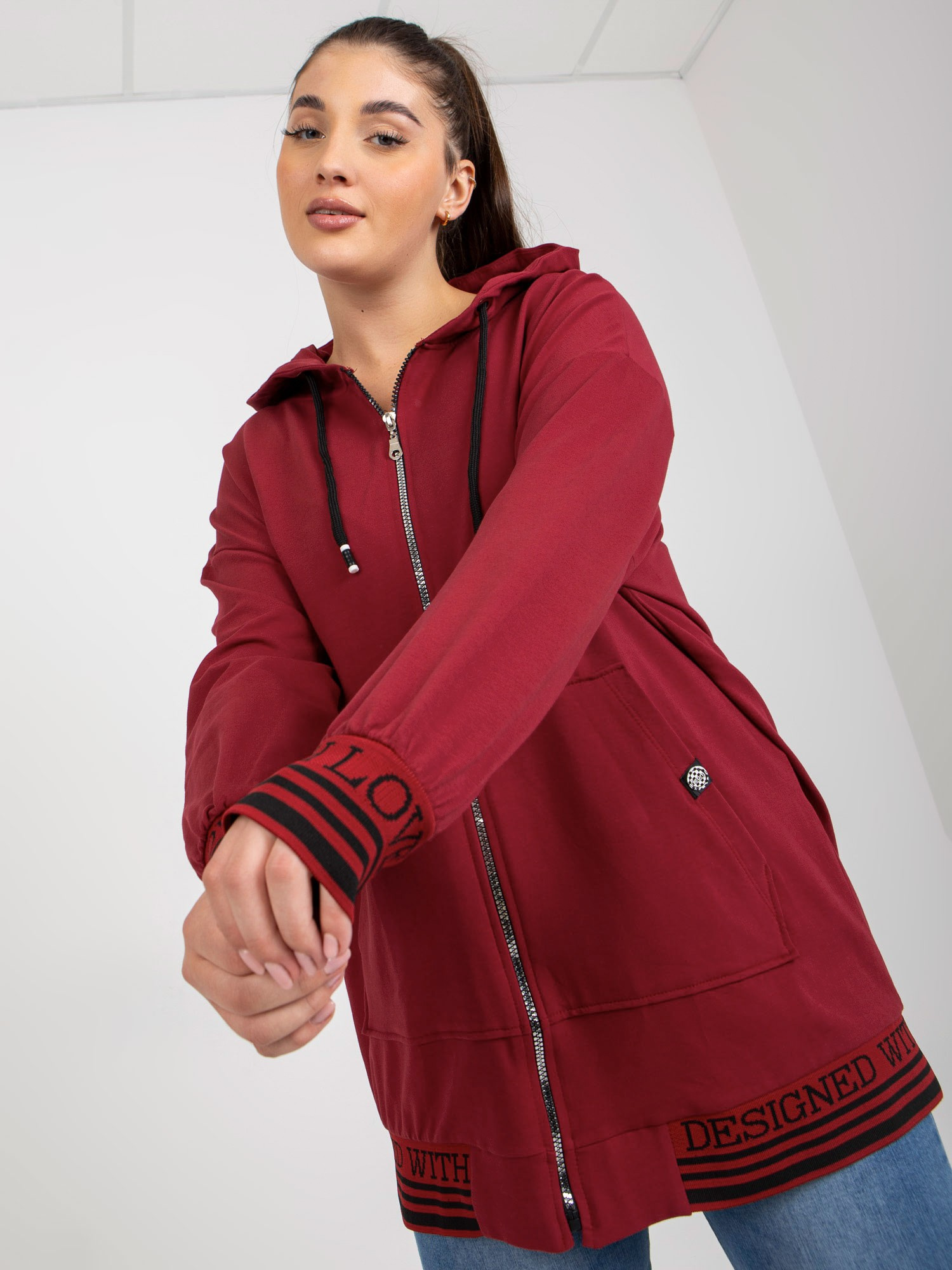 Bordowa rozpinana bluza plus size z kieszeniami .