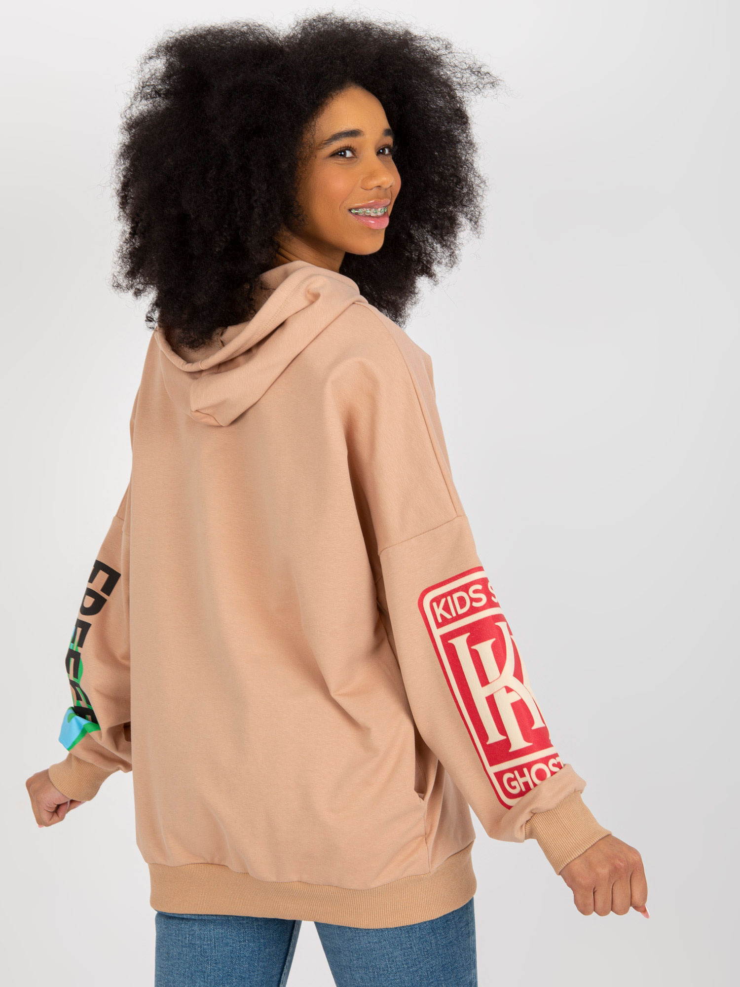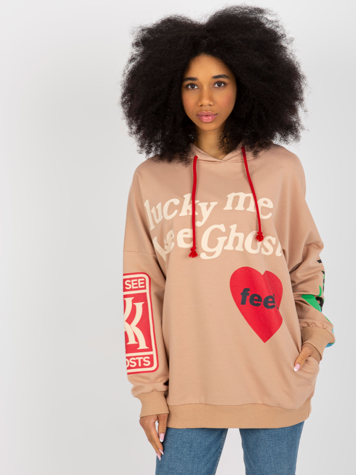 Camelowa dresowa bluza z nadrukiem i kapturem .