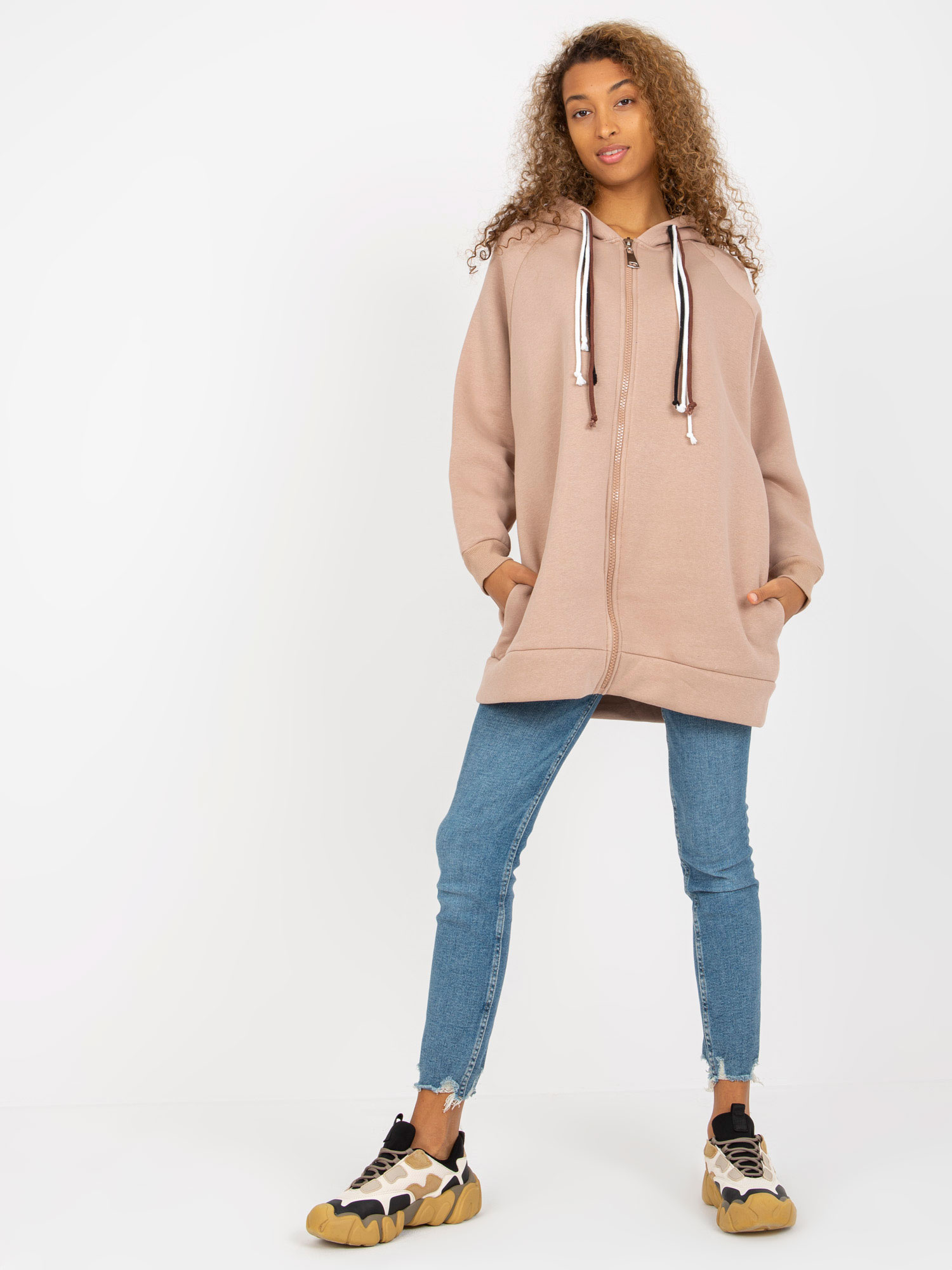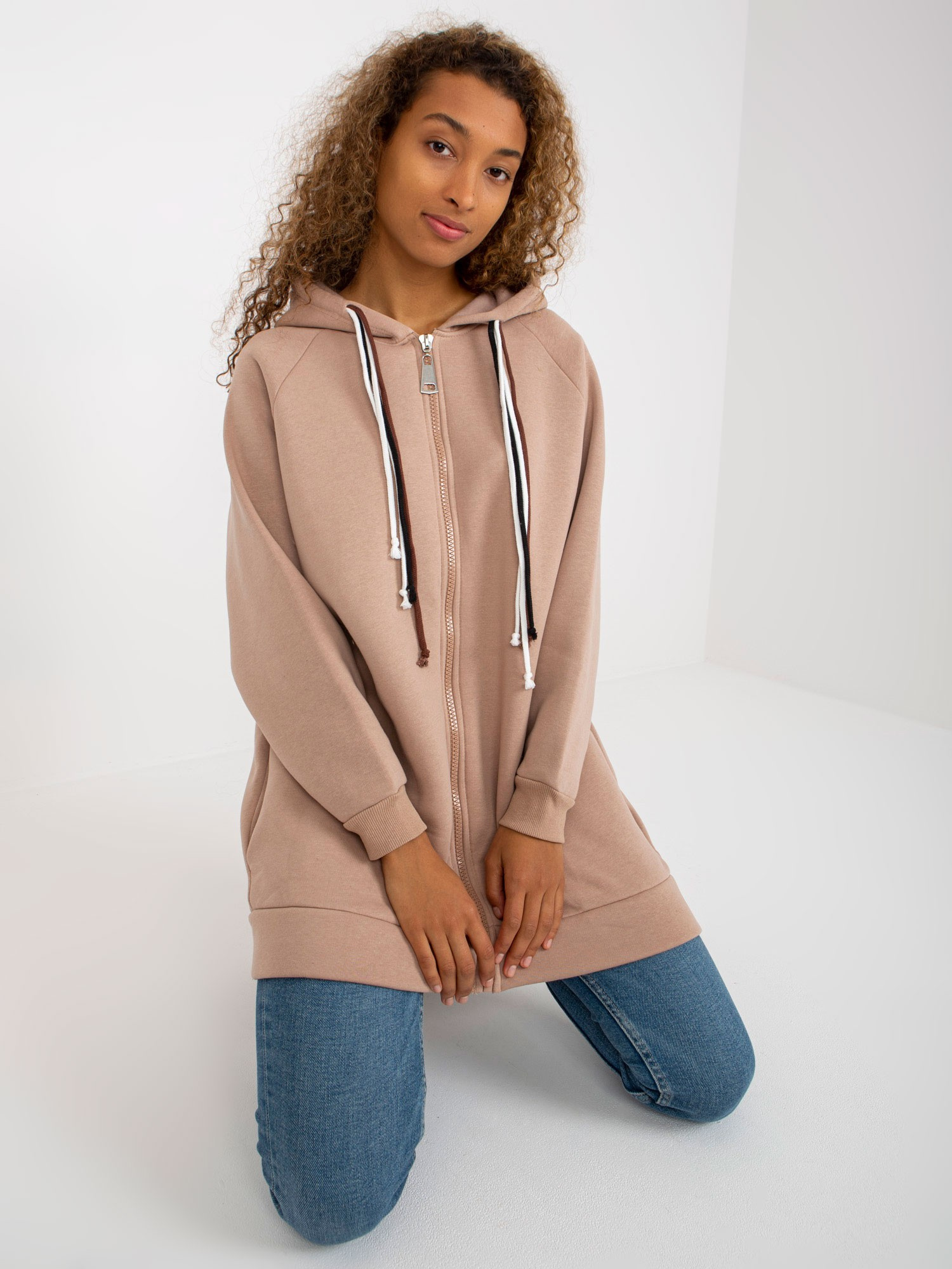 Ciemnobeżowa długa dresowa bluza rozpinana z kapturem .