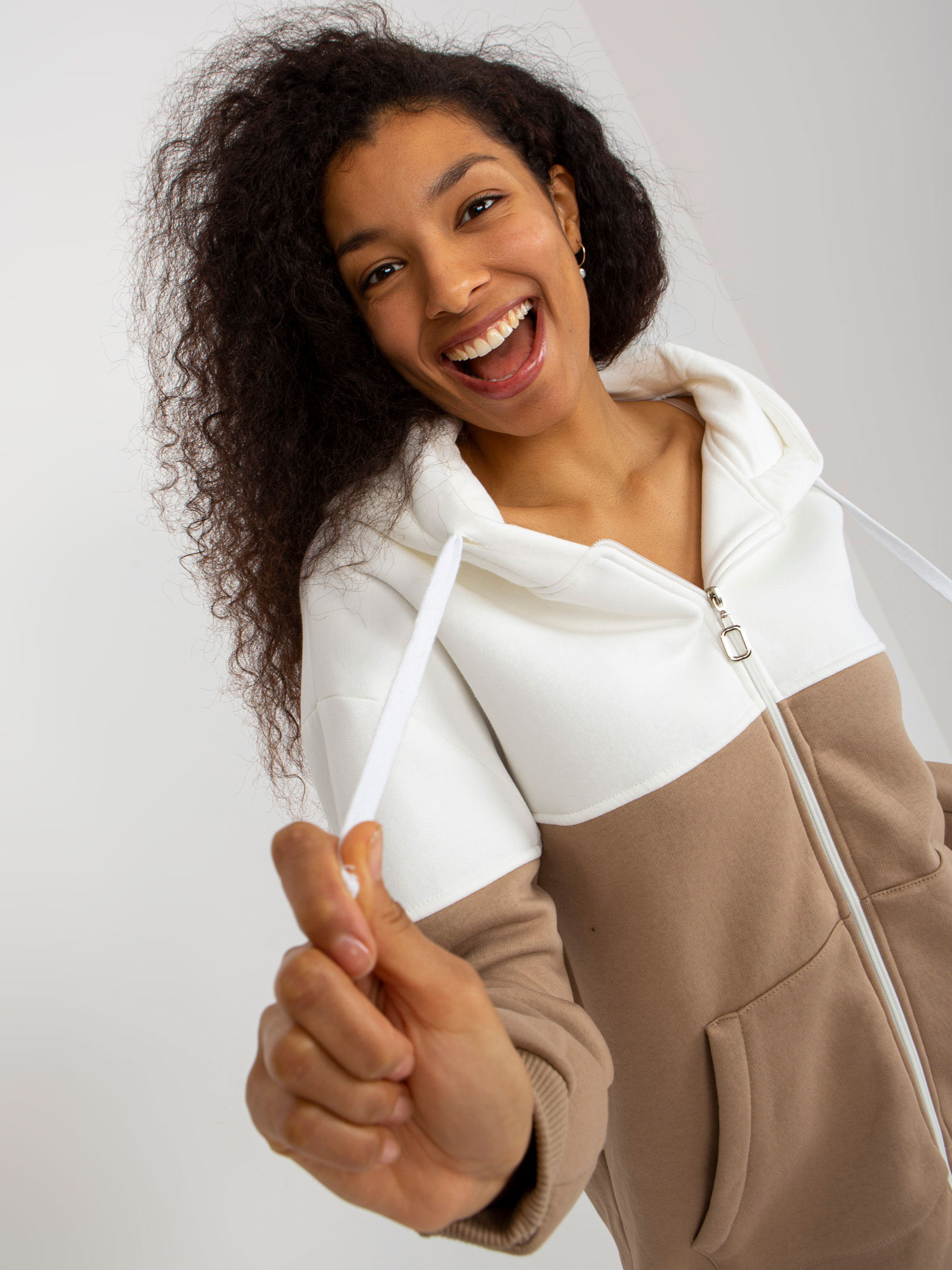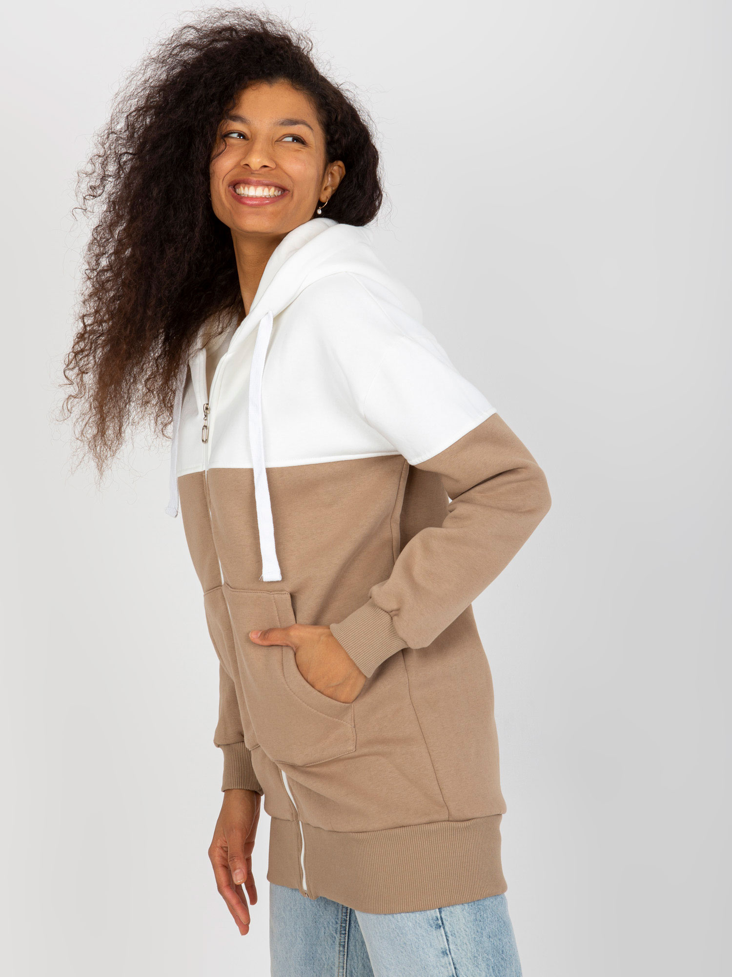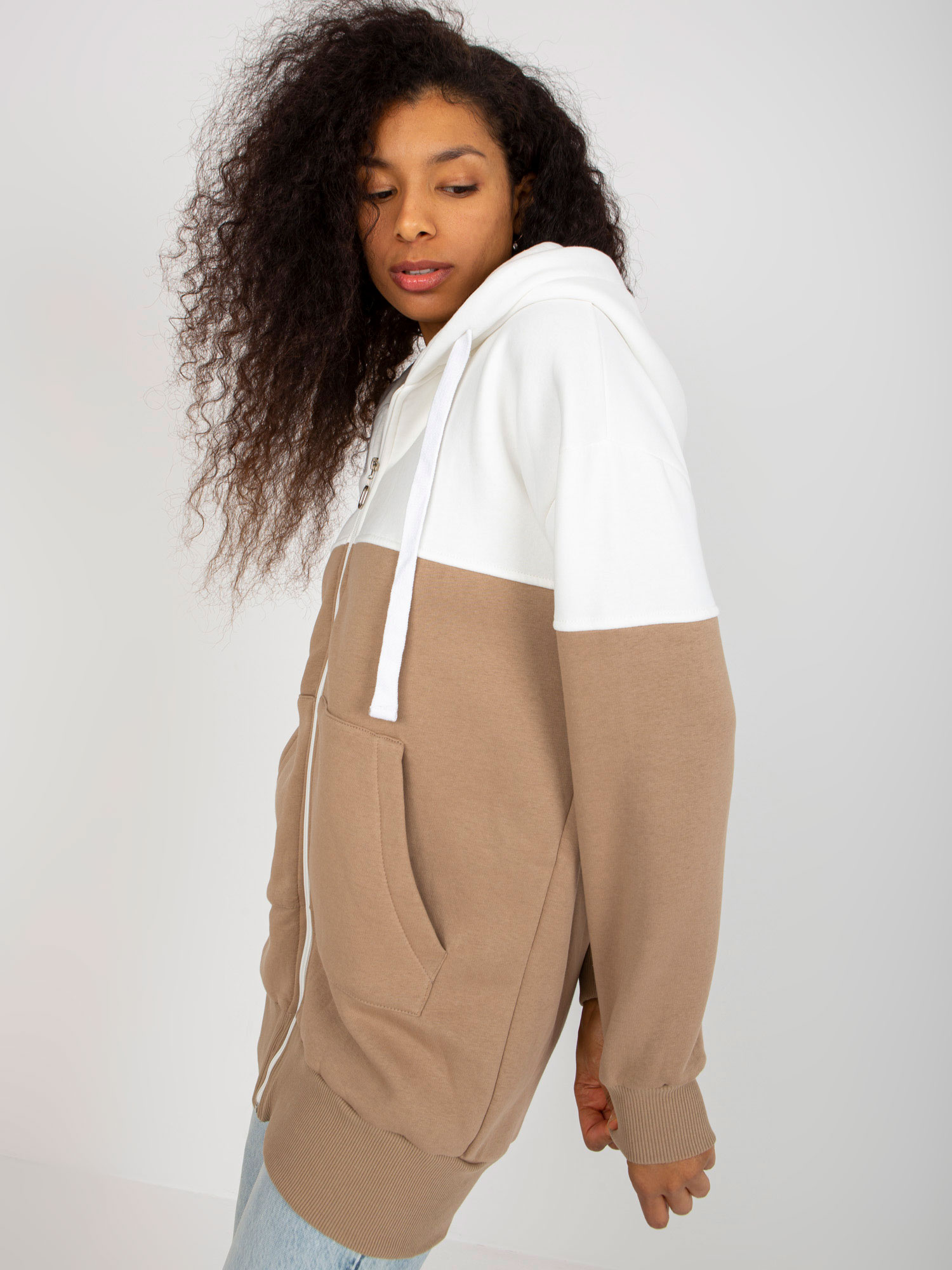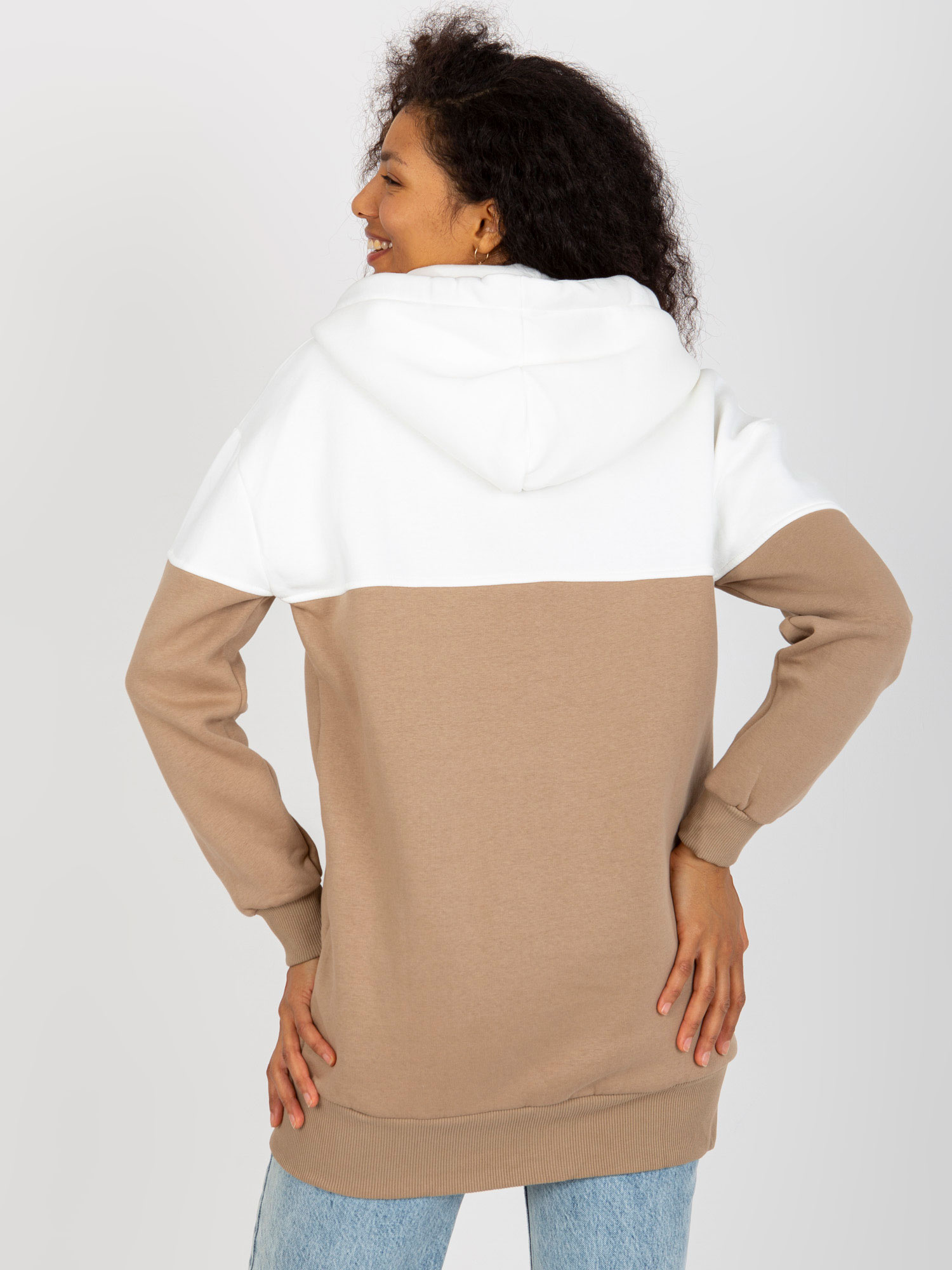 Ecru-ciemnobeżowa dresowa długa bluza basic z kapturem .