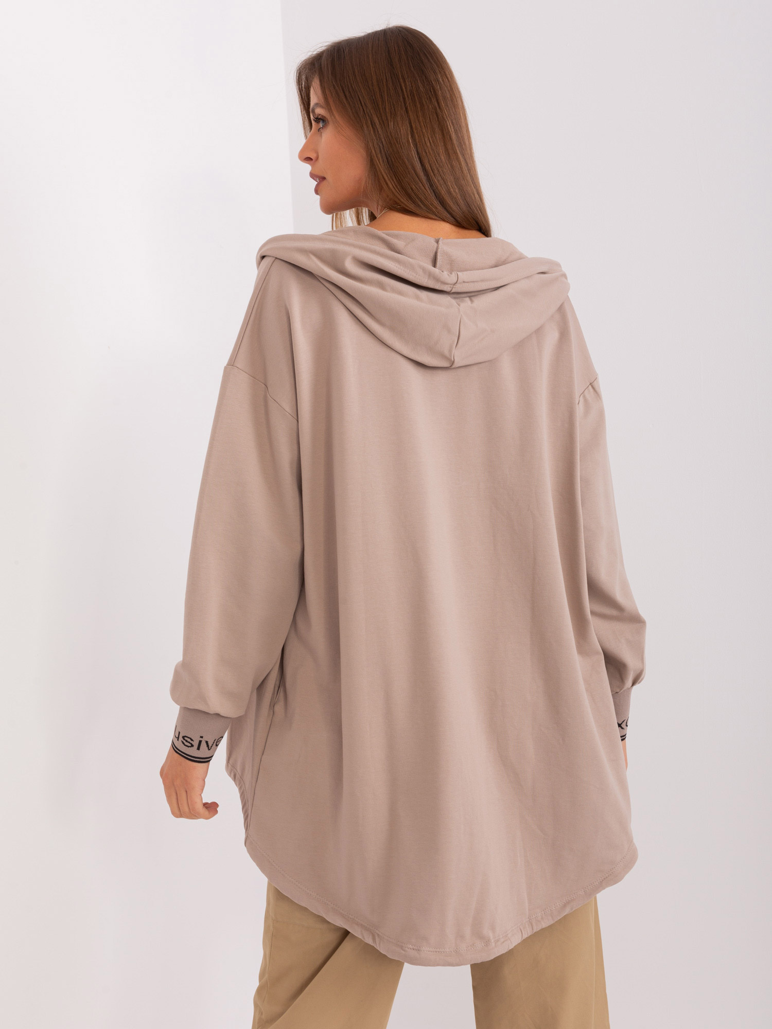 Ciemnobeżowa damska bluza rozpinana z kapturem .