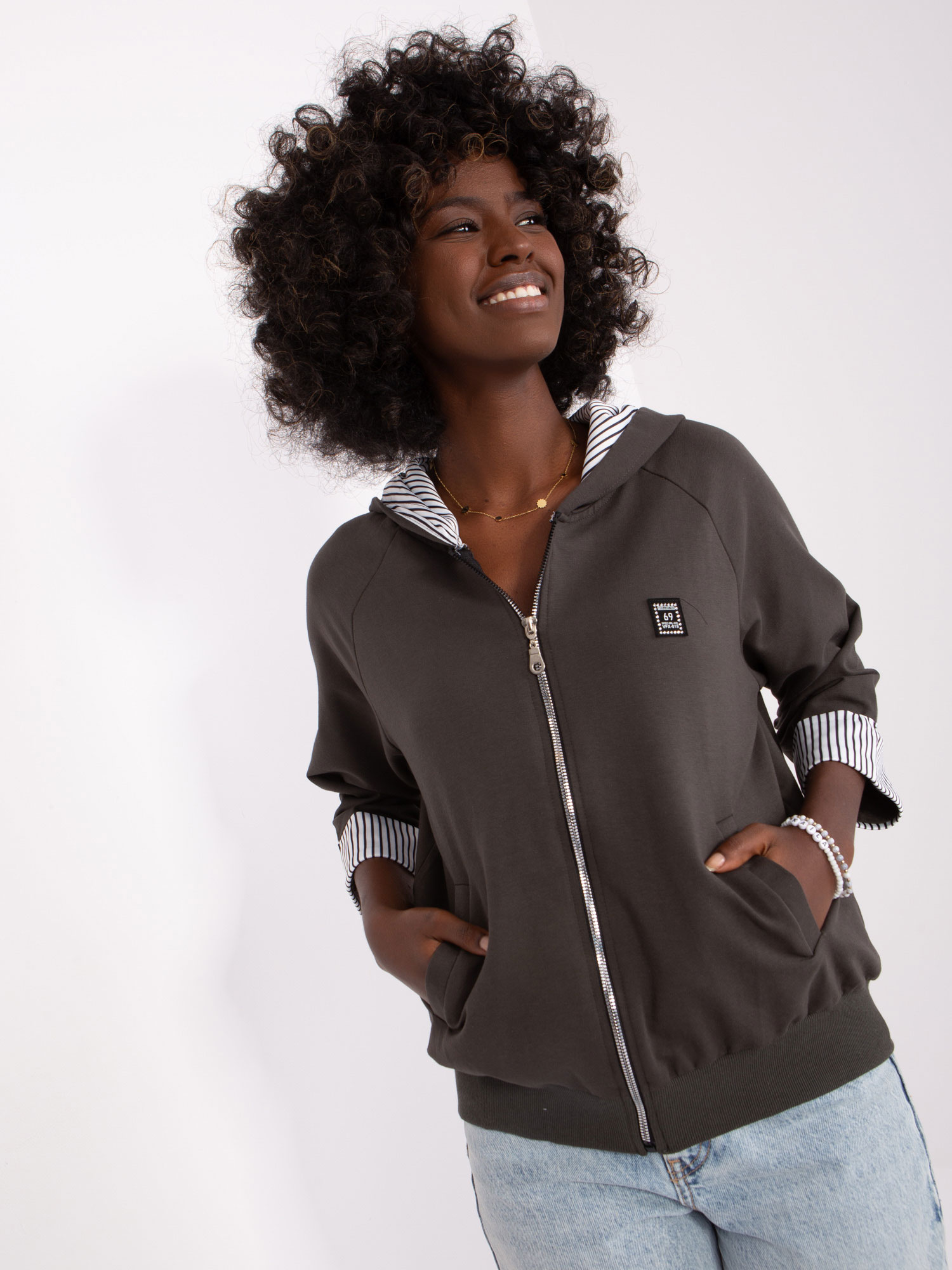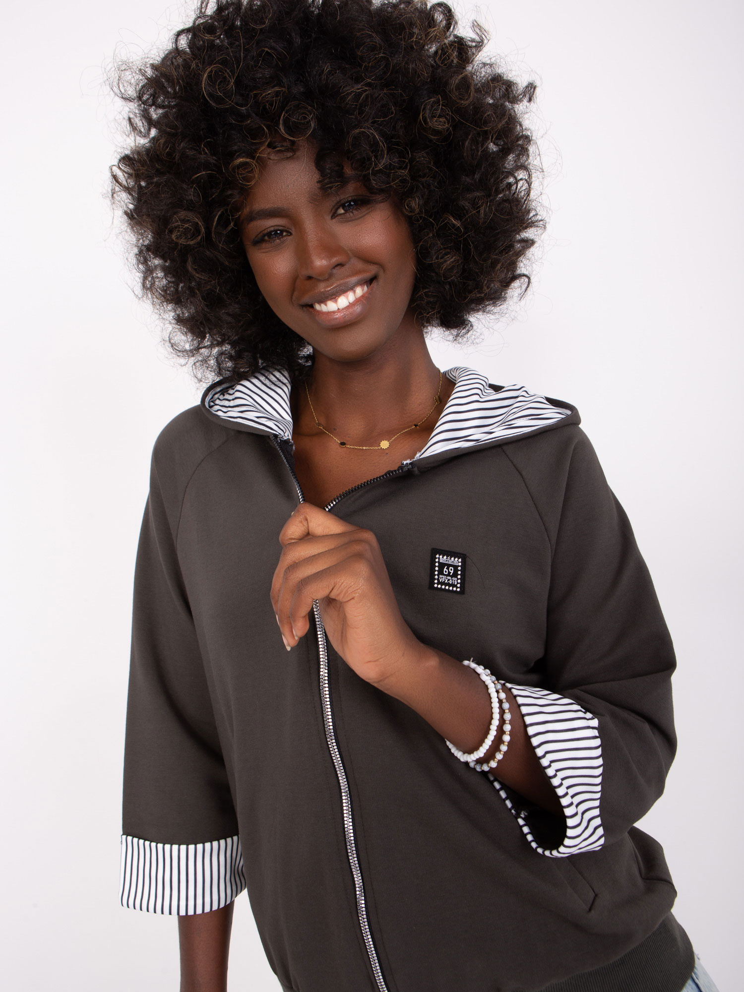 Khaki krótka bluza rozpinana z rękawem 3/4 .