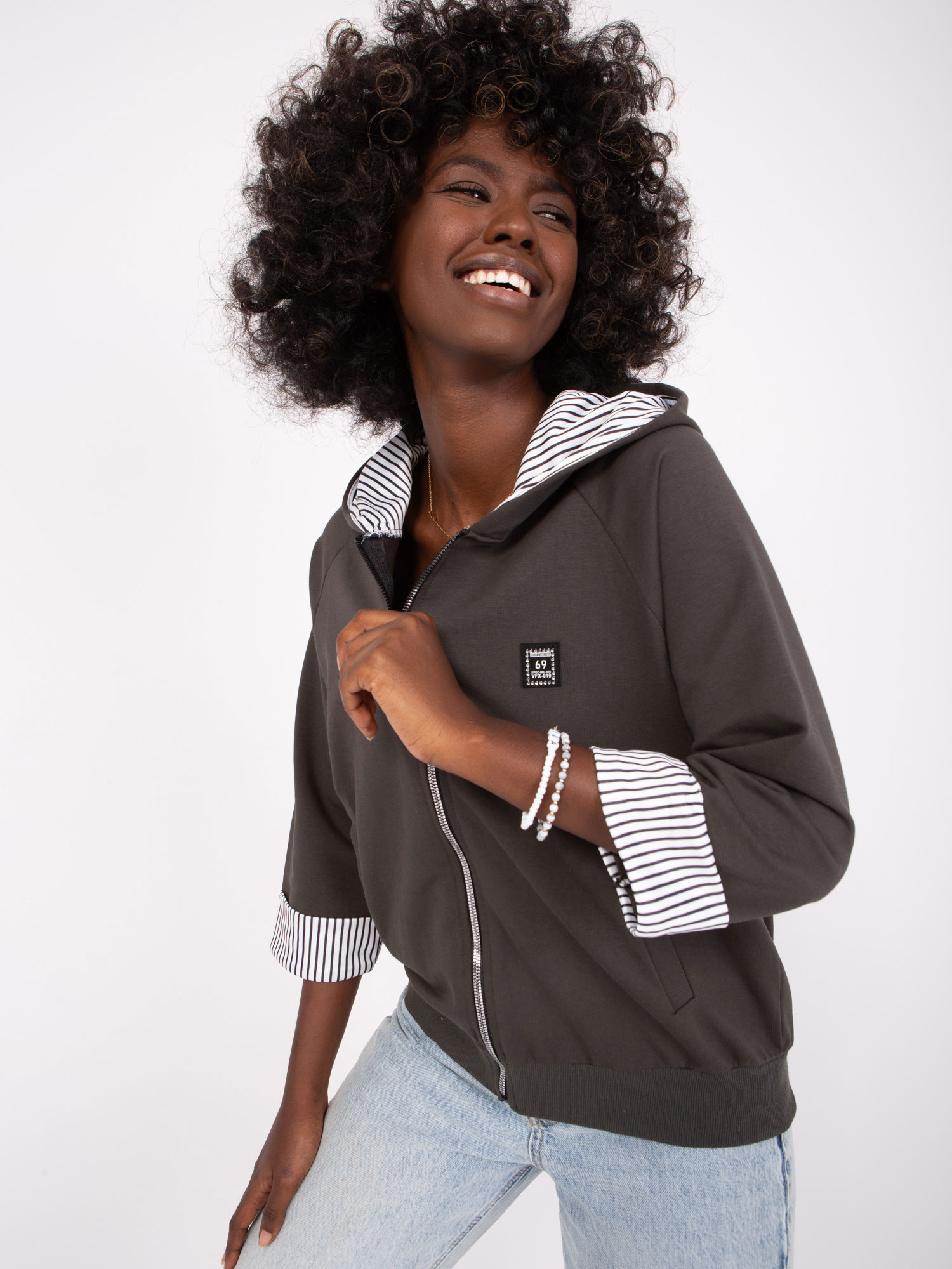 Wymiary bluzy w rozmiarze one size mierzone na płasko: szerokość pod pachami – 55 cm, długość rękawa – 43 cm, długość całkowita – 57 cm.
