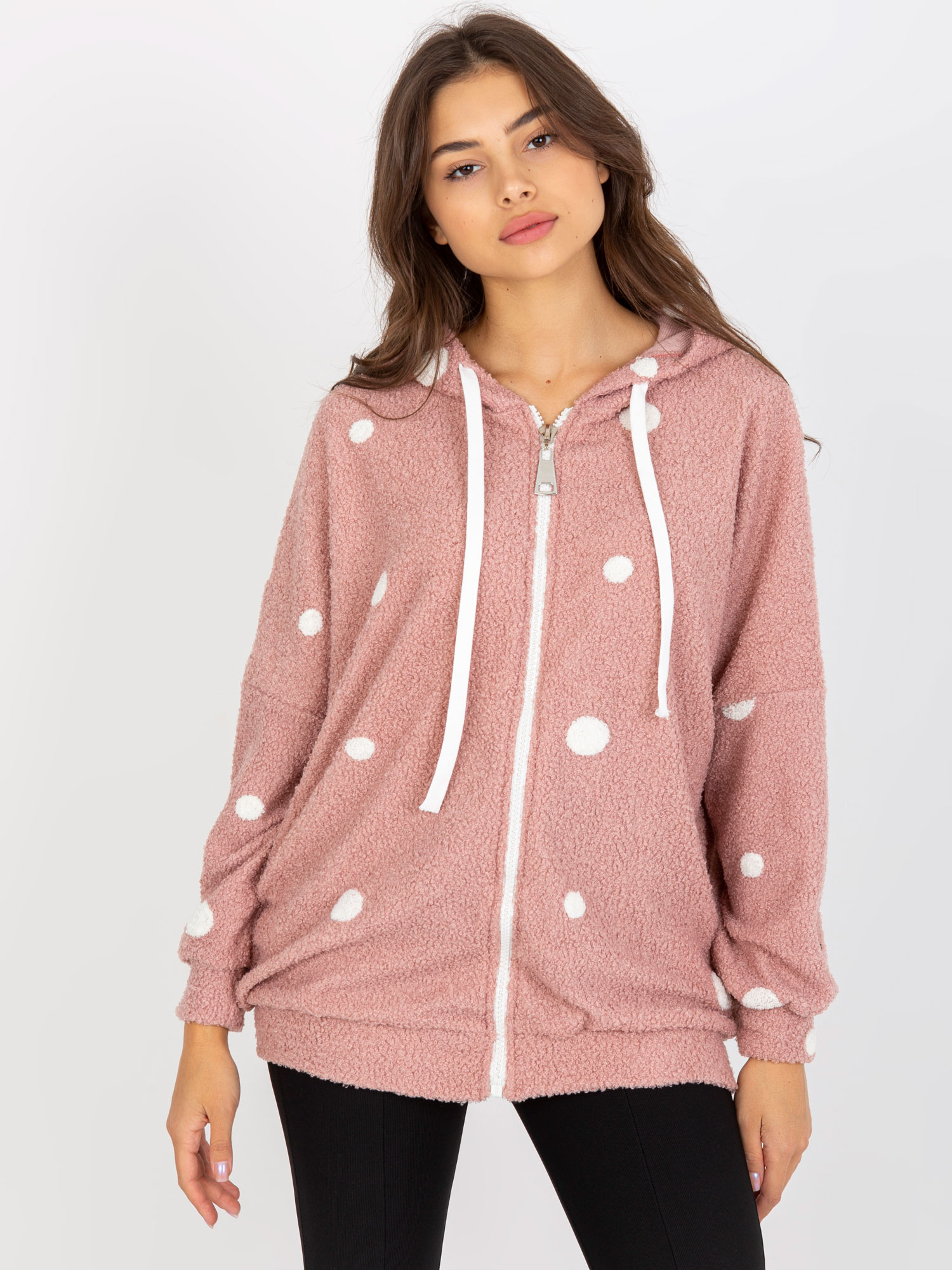 Brudnoróżowa pluszowa bluza rozpinana w kropki .