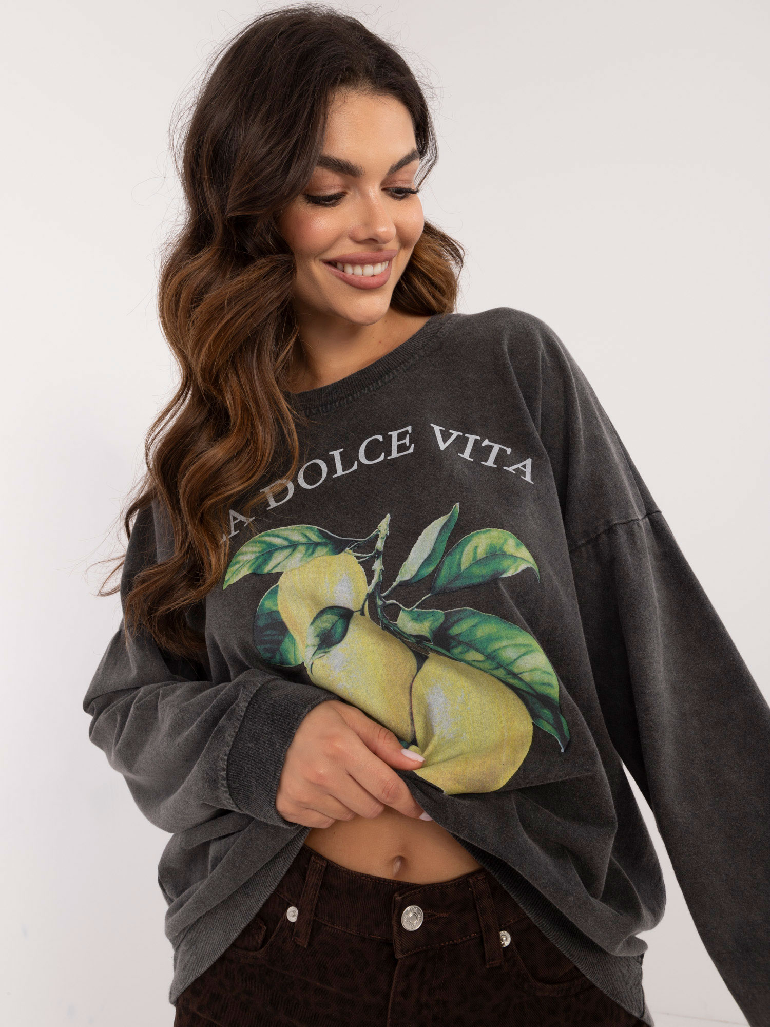 Wymiary bluzy w rozmiarze one size mierzone na płasko: szerokość pod pachami – 63 cm, długość rękawa – 63 cm, długość całkowita – 79 cm.