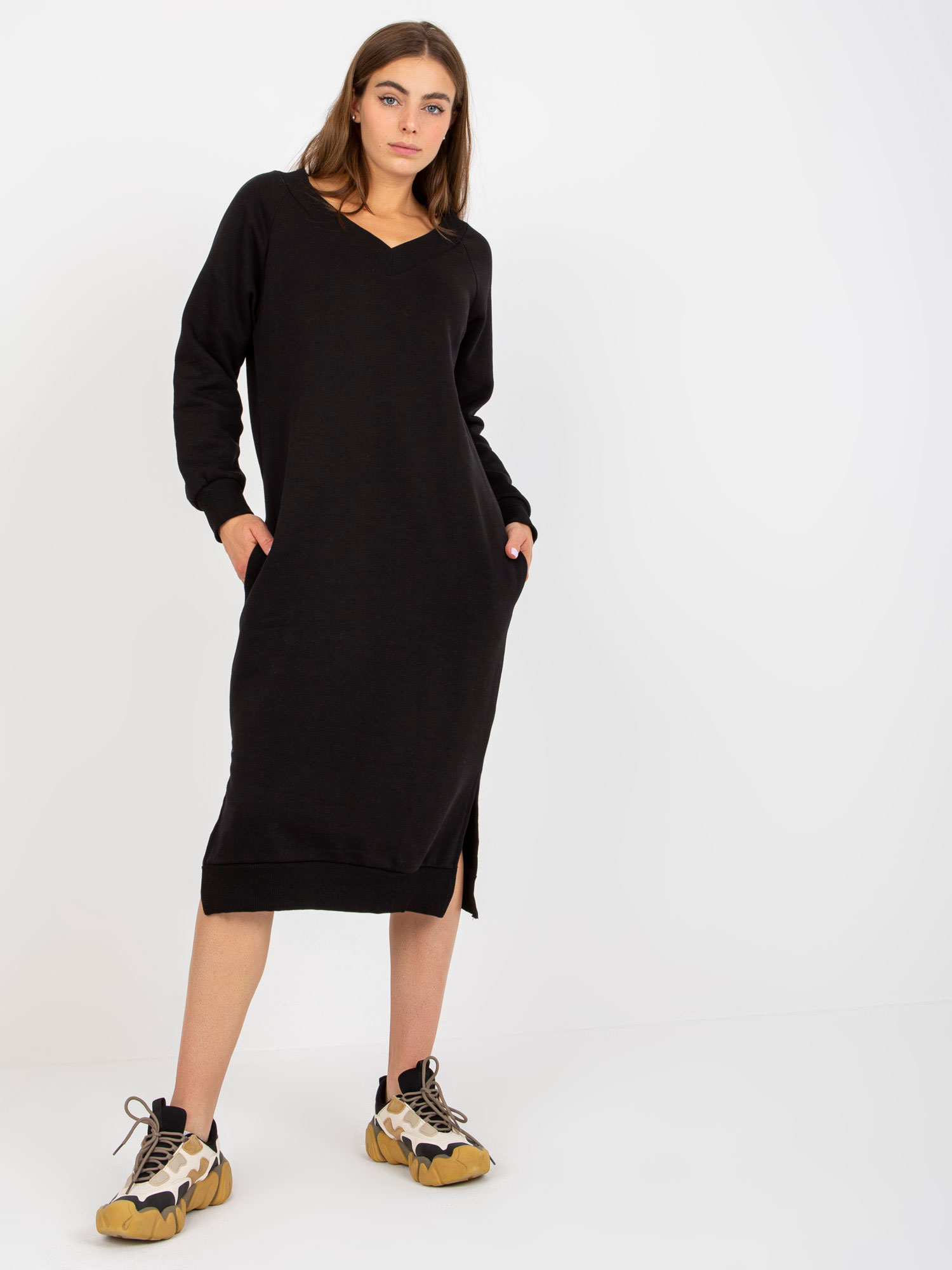 Czarna midi sukienka dresowa z kieszeniami .