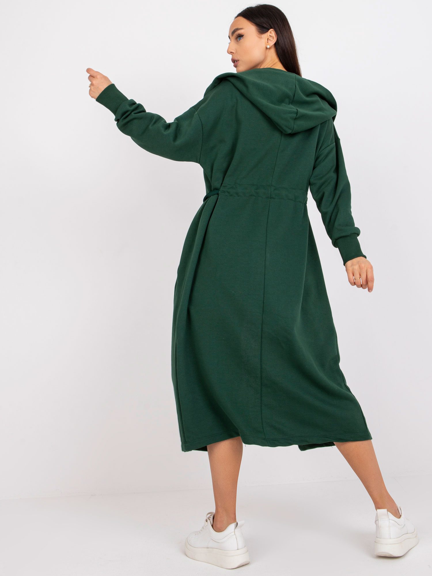 Modelka ma na sobie rozmiar one size. Wymiary modelki: wzrost 174 cm, biust 100 cm, talia 74 cm, biodra 107 cm.