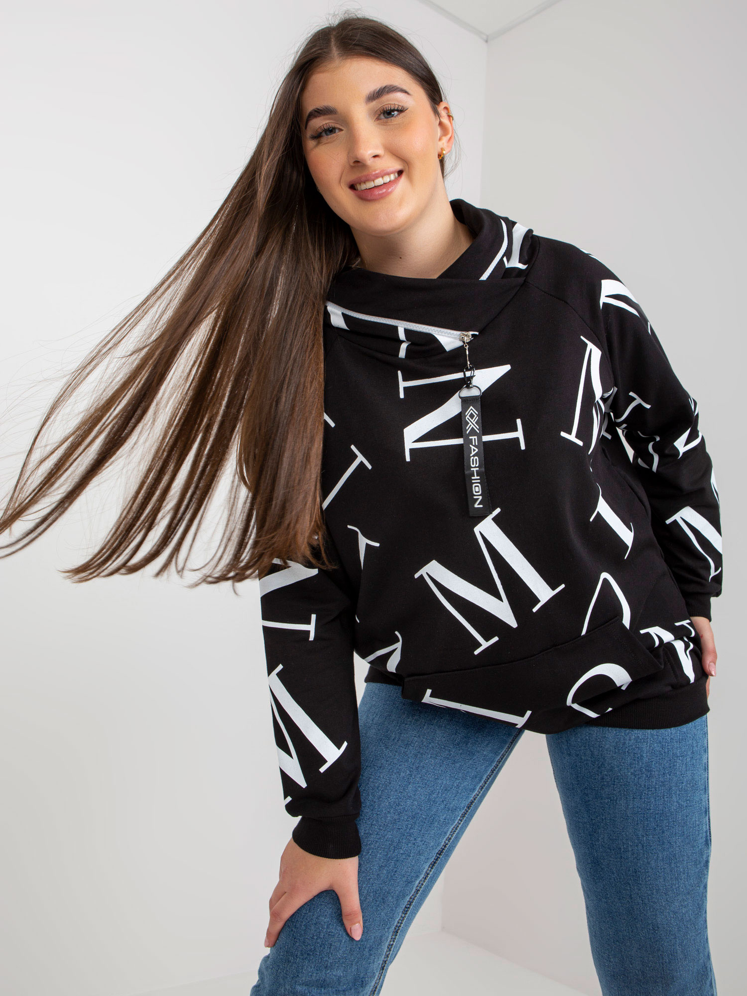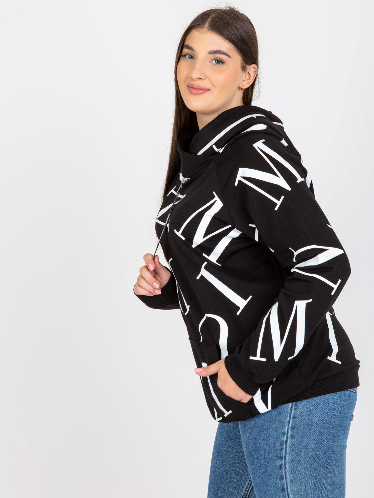 Czarna damska bluza plus size kangurka z nadrukiem .