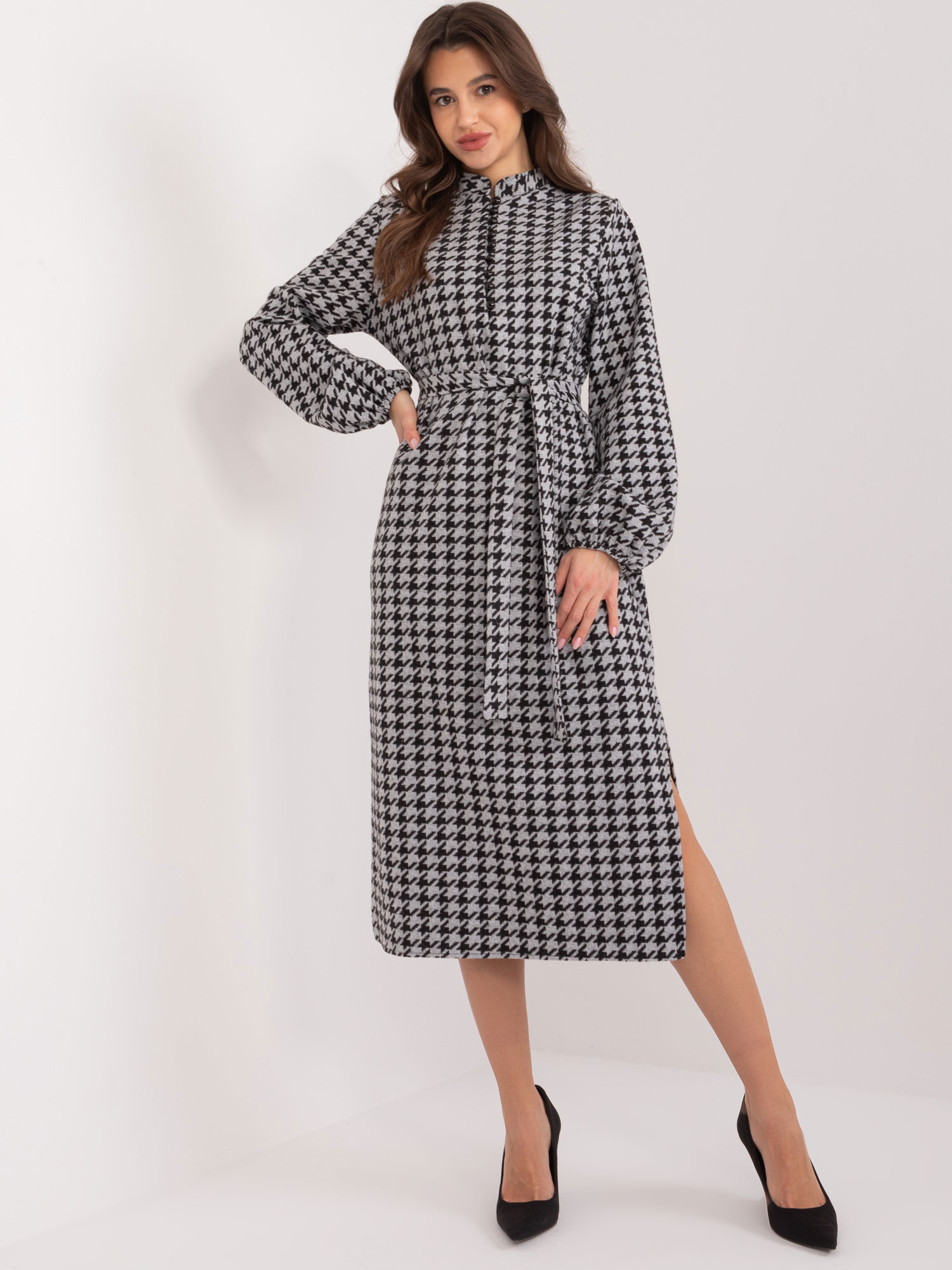 Modelka ma na sobie rozmiar S. Wymiary modelki: wzrost 168 cm, biust 82 cm, talia 62 cm, biodra 93 cm.