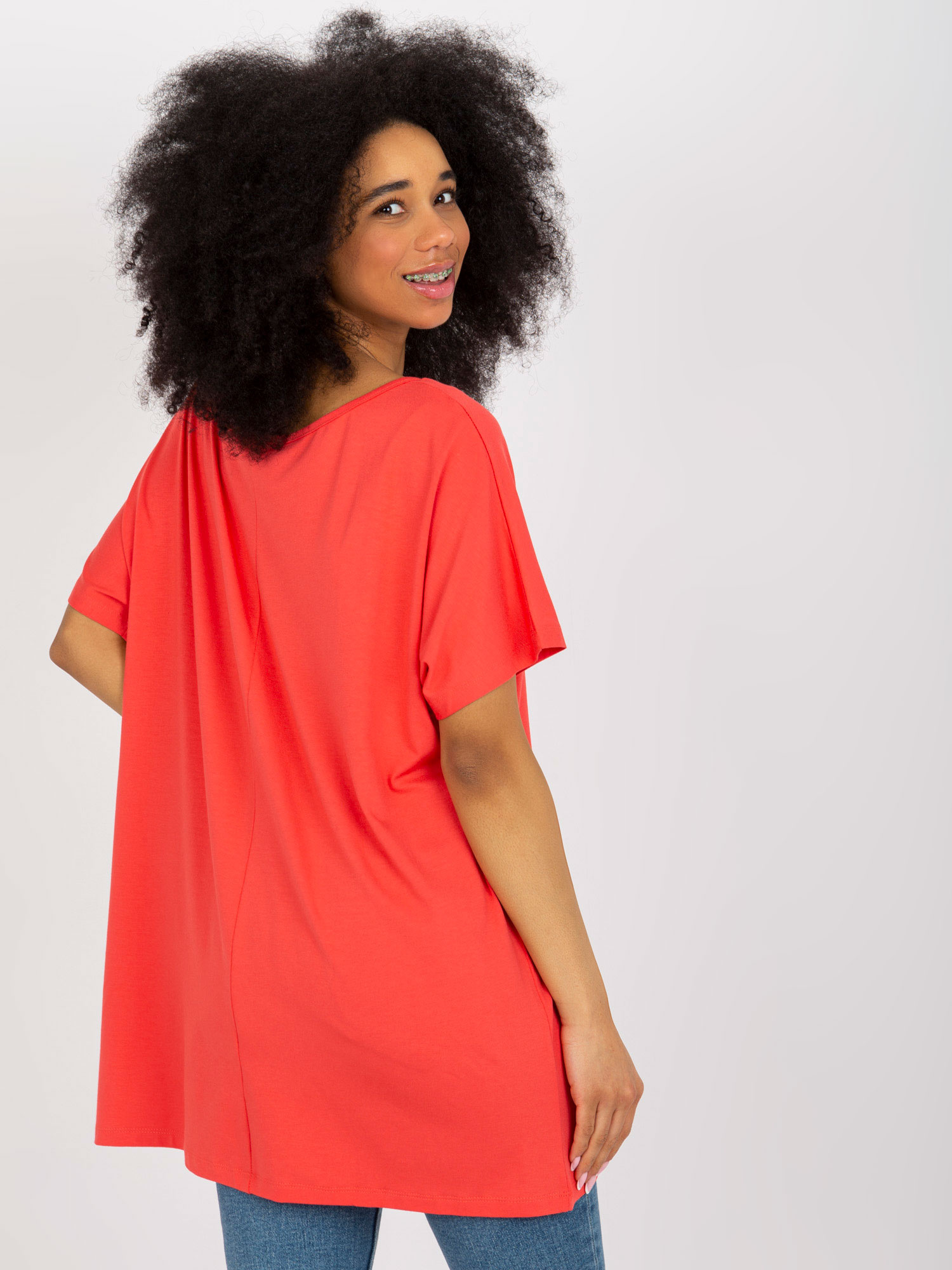 Wymiary bluzy w rozmiarze one size mierzone na płasko: szerokość pod pachami – 58 cm, długość rękawa – 50 cm, długość całkowita – 73 cm .