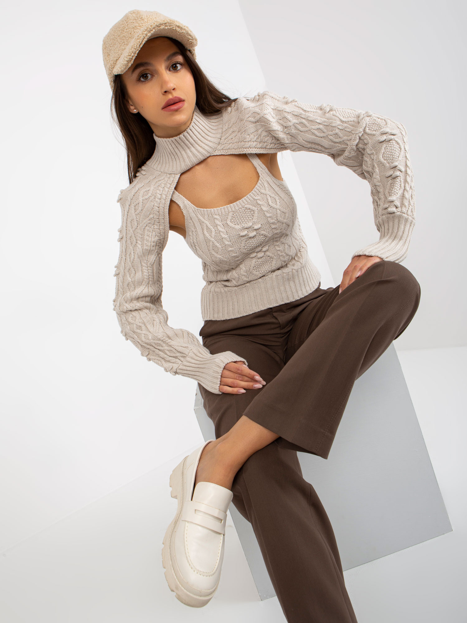Modelka ma na sobie rozmiar S. Wymiary modelki: wzrost 175 cm, biust 85 cm, talia 63 cm, biodra 95 cm.