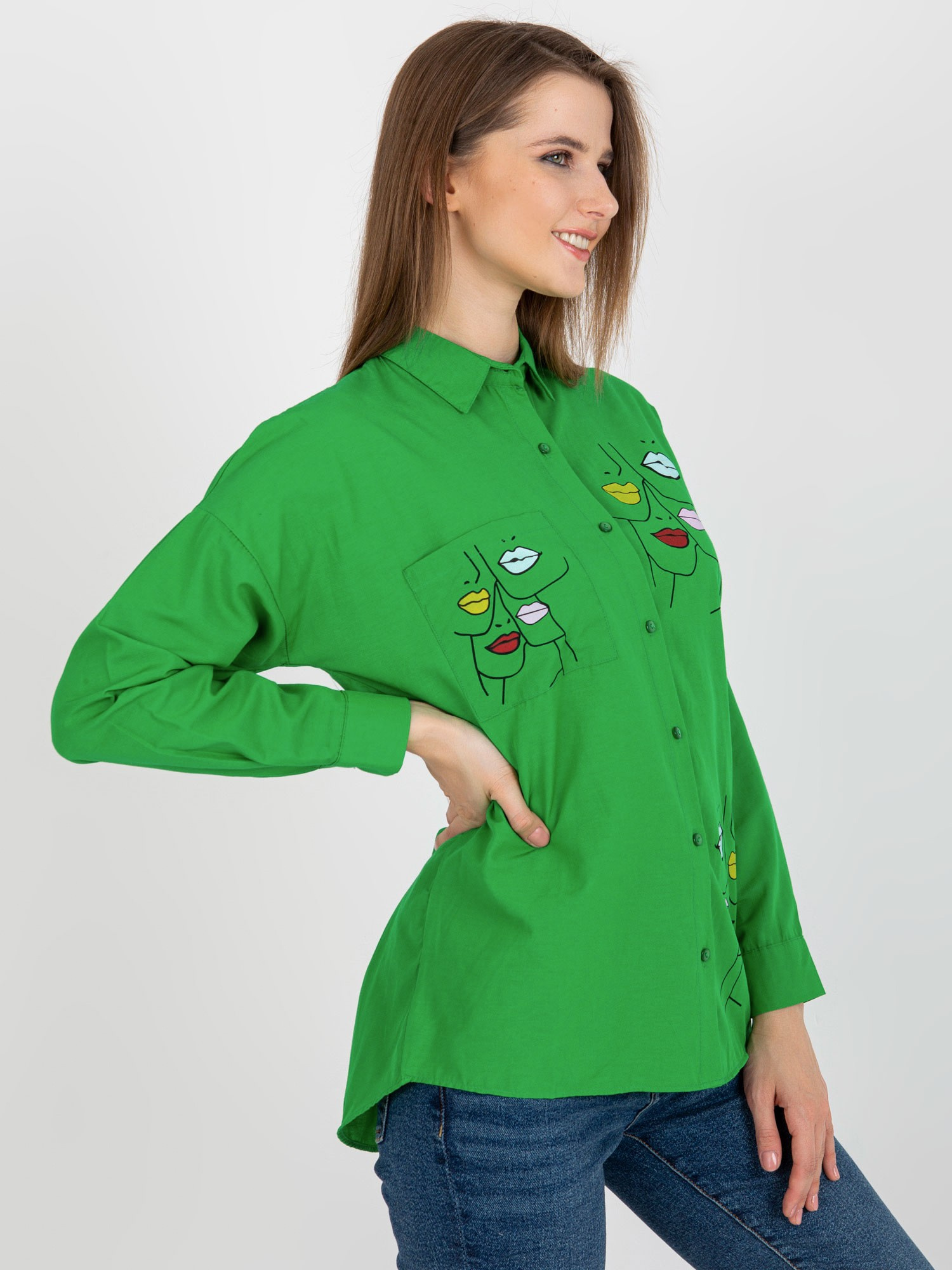 Wymiary bluzy w rozmiarze one size mierzone na płasko: szerokość pod pachami – 59 cm, długość całkowita – 63 cm, długość rękawa – 49 cm