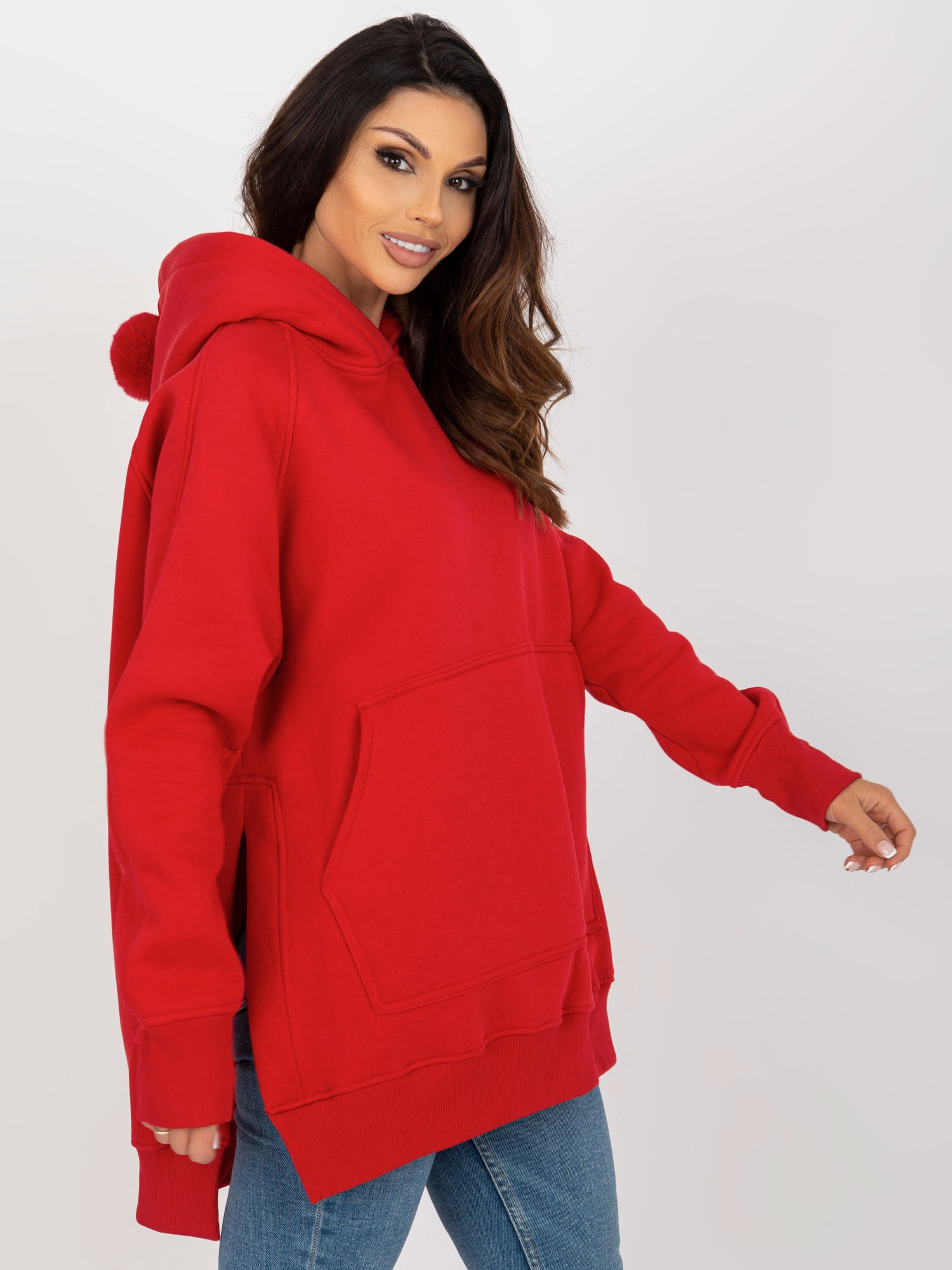 Czerwona długa bluza kangurka z pomponami .