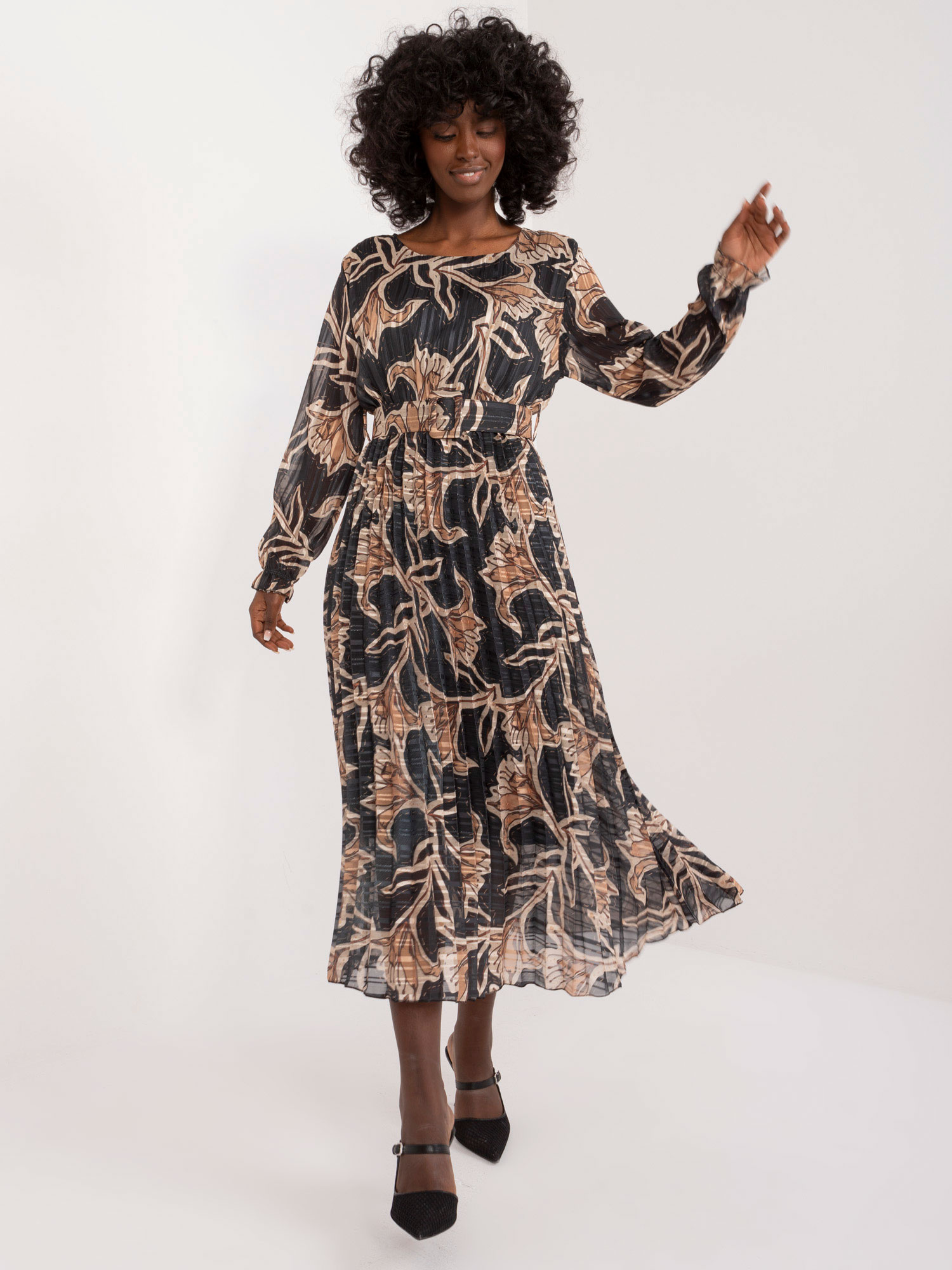 Modelka ma na sobie rozmiar S. Wymiary modelki: wzrost 175 cm, biust 90 cm, talia 66 cm, biodra 94 cm.