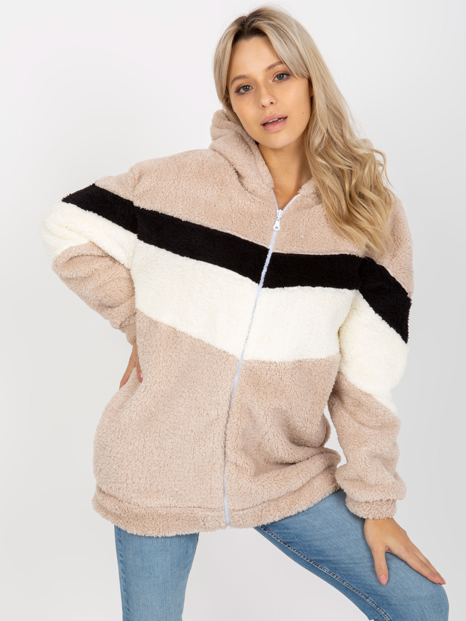 • Modelka: Modelka ma na sobie rozmiar one size. Wymiary modelki: wzrost 173 cm, biust 85 cm, talia 62 cm, biodra 95 cm