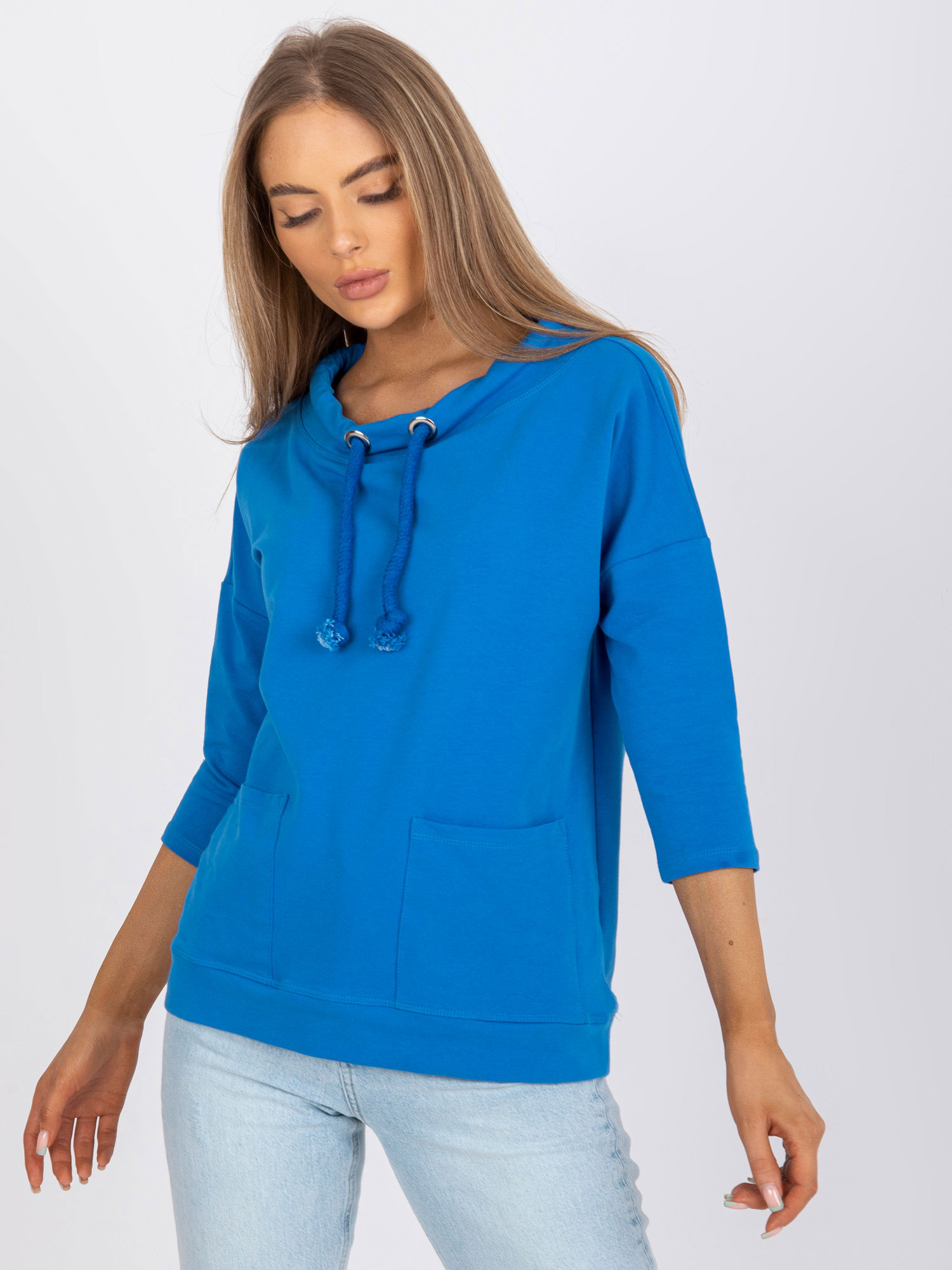 Wymiary bluzy w rozmiarze S/M mierzone na płasko: szerokość pod pachami – 63 cm, długość całkowita – 76 cm, długość rękawa – 51 cm.