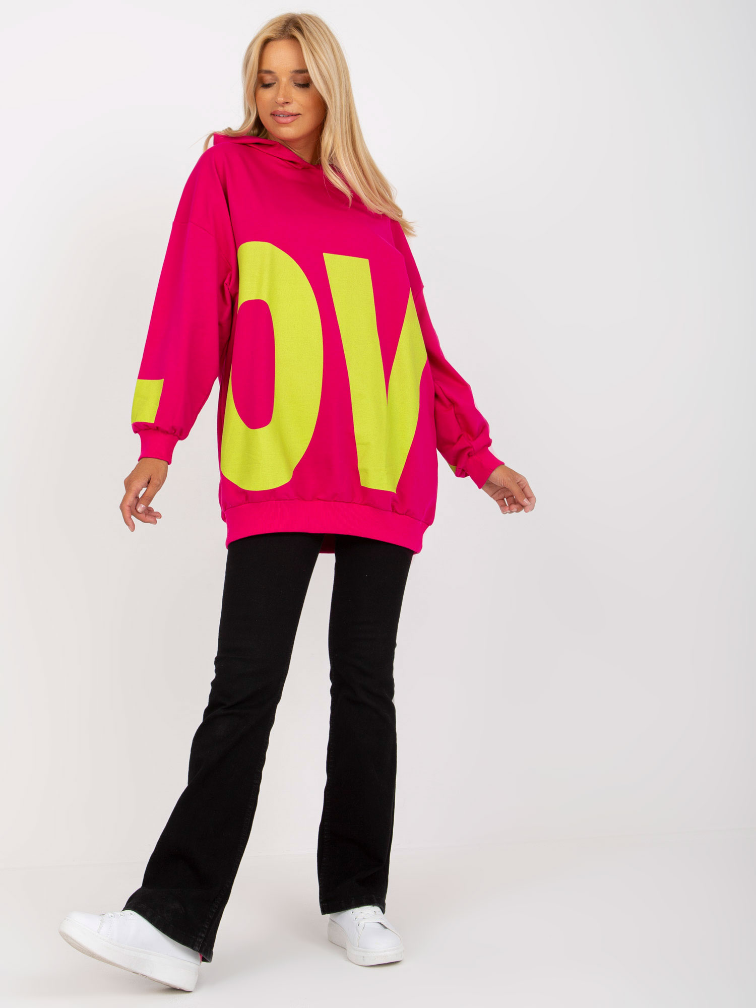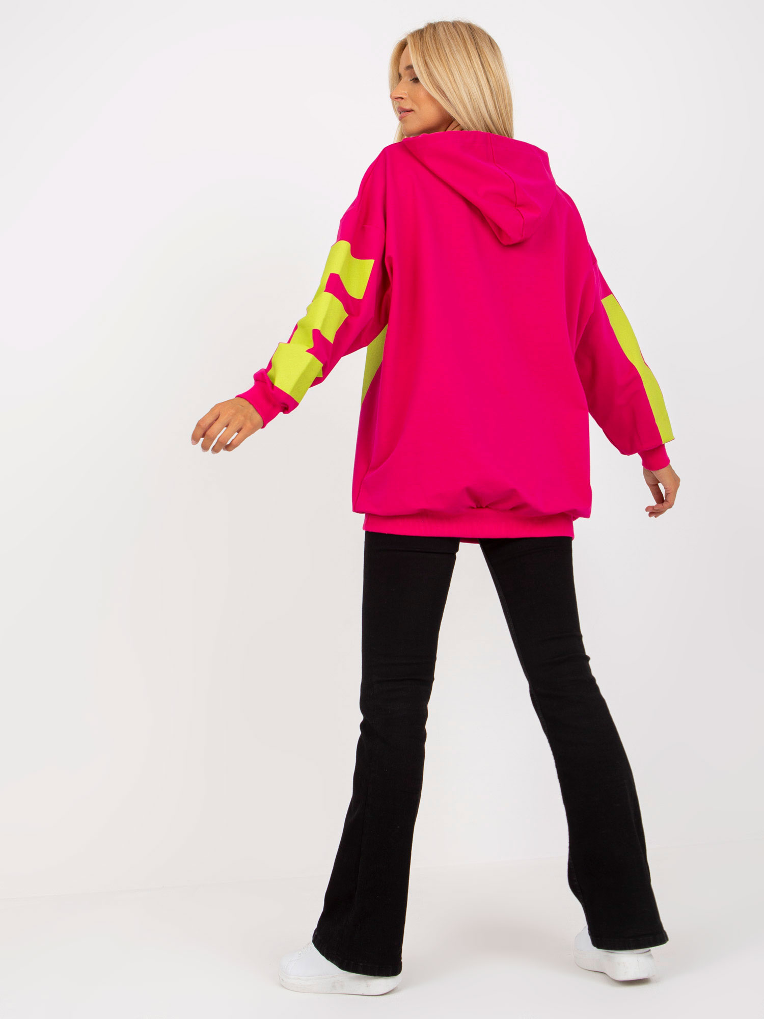 Fuksjowo-zielona dresowa bluza z kapturem i nadrukiem .