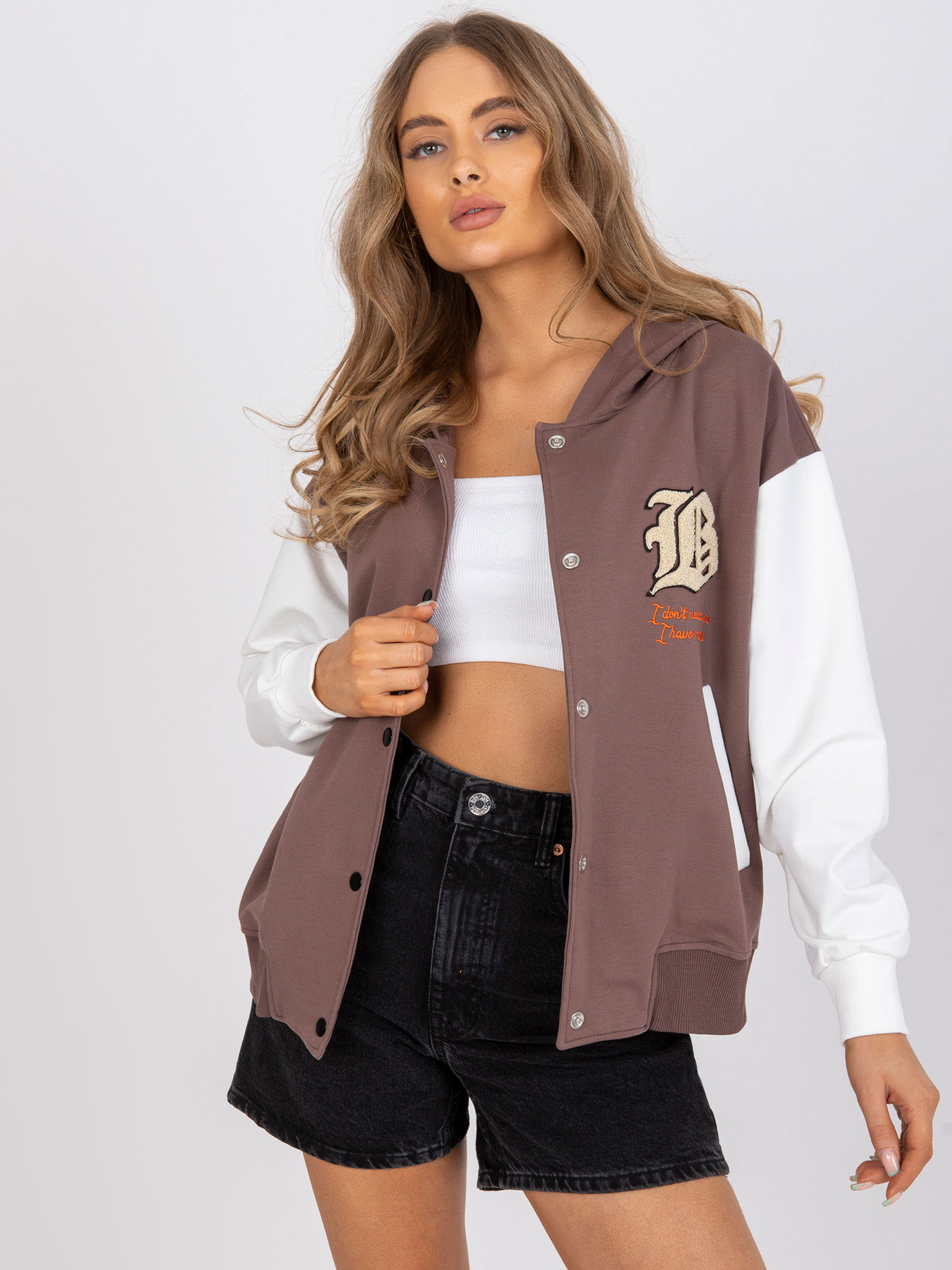 Wymiary bluzy w rozmiarze one size mierzone na płasko: szerokość pod pachami – 65 cm, długość rękawa – 61 cm, długość całkowita – 78 cm.