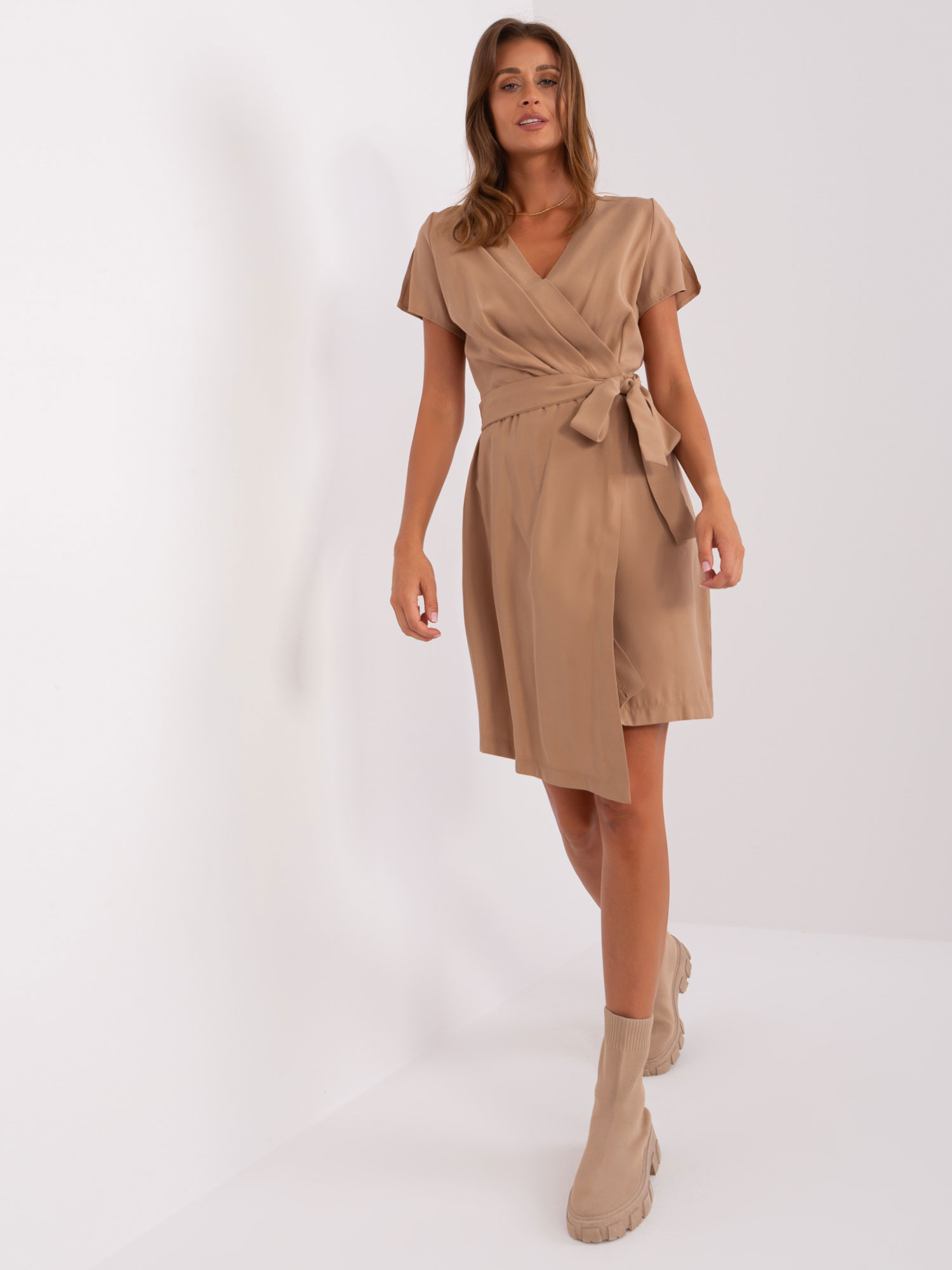 Modelka ma na sobie rozmiar one size. Wymiary modelki: wzrost 181 cm, biust 87 cm, talia 67 cm, biodra 96 cm.