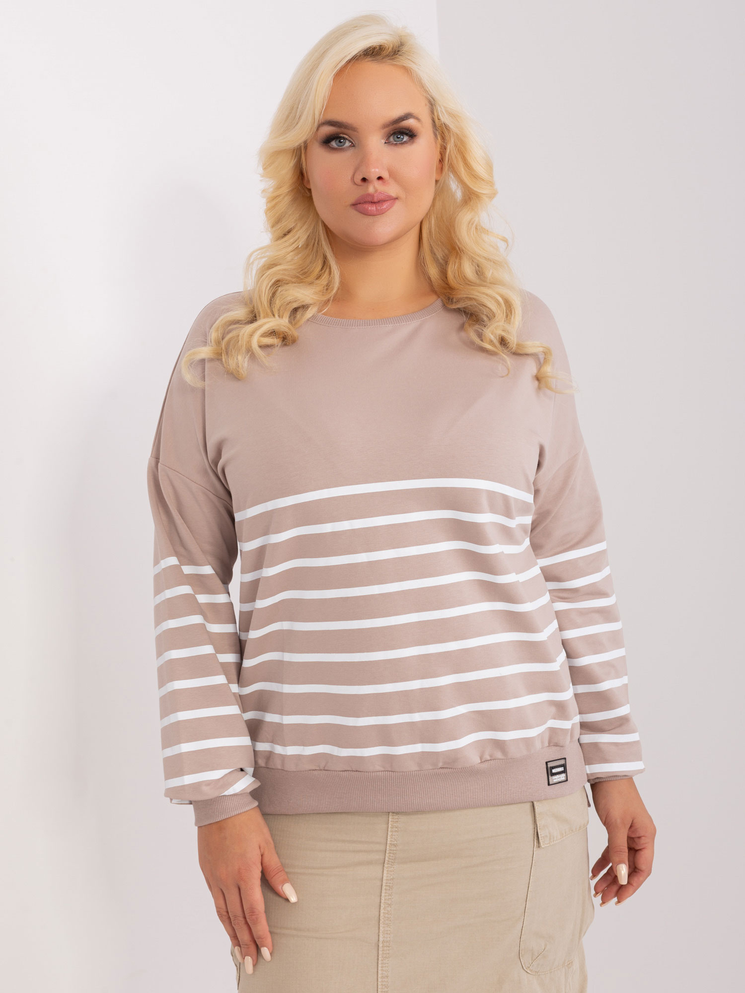 Wymiary bluzy w rozmiarze one size mierzone na płasko: szerokość pod pachami – 54 cm, długość całkowita – 64 cm, długość rękawa – 55 cm.