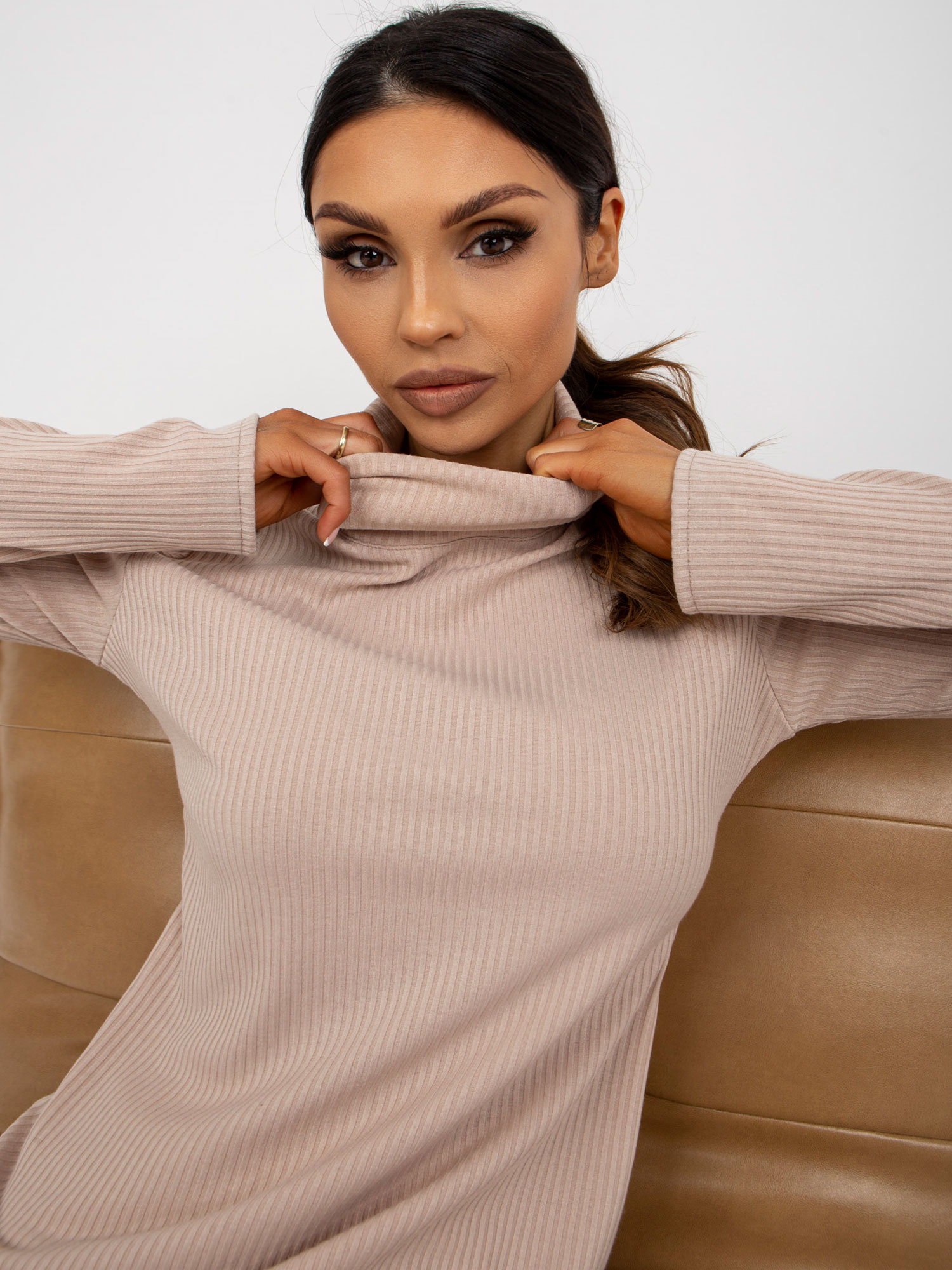Beżowa codzienna prążkowana bluzka z golfem od kompletu .