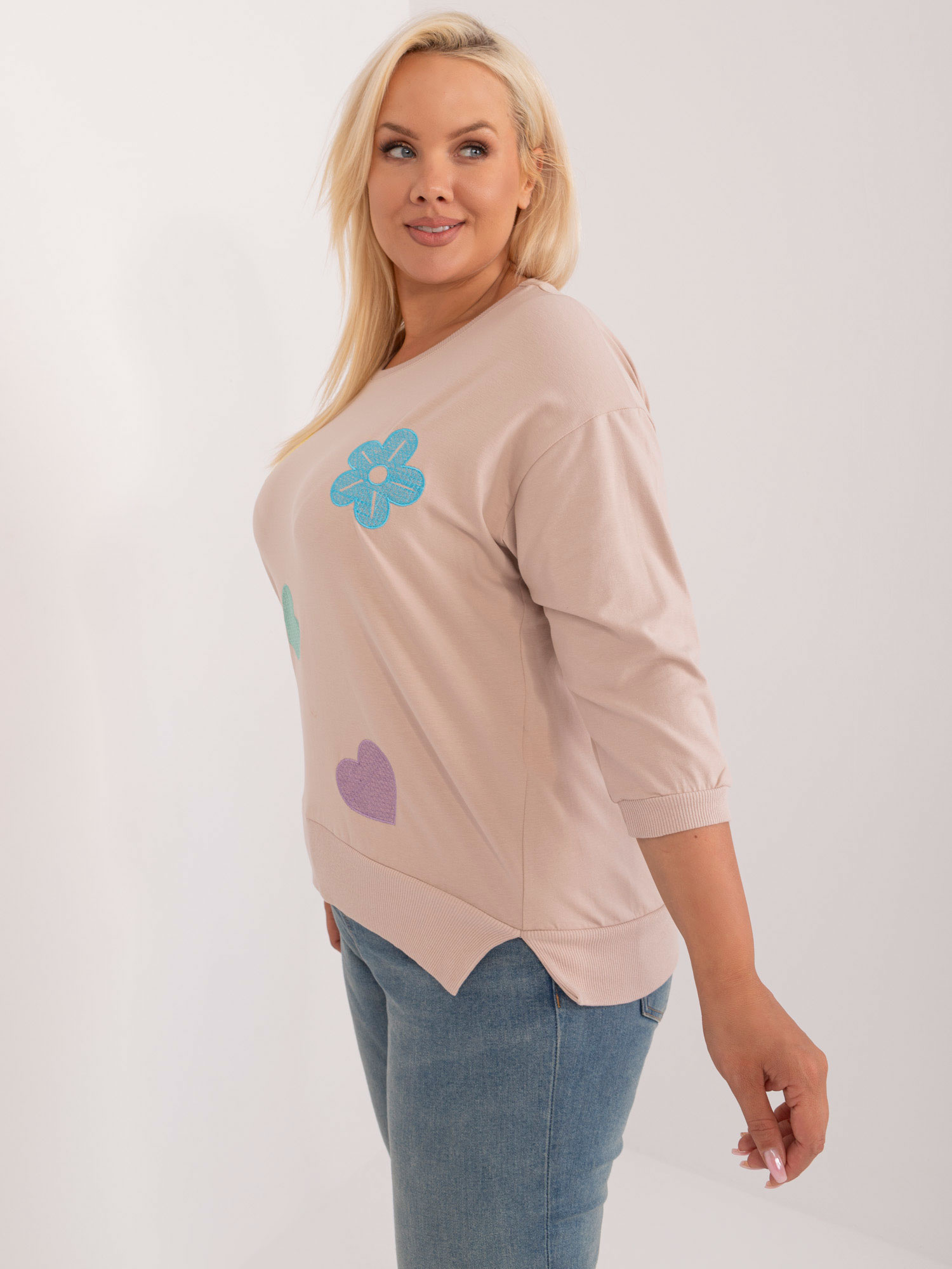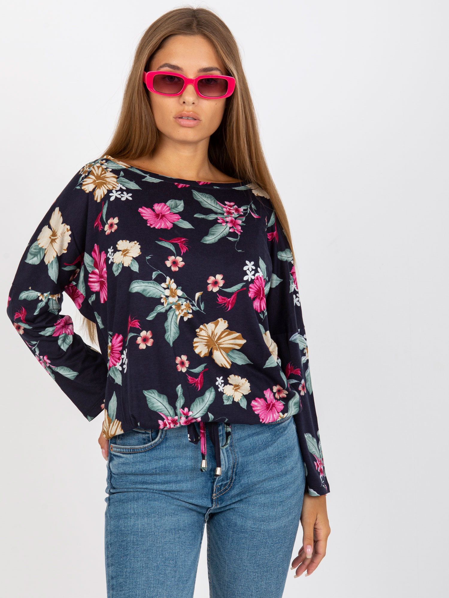 Wymiary bluzki w rozmiarze one size mierzone na płasko: szerokość pod pachami – 60 cm, długość rękawa – 44 cm, długość całkowita (przód) – 63 cm, długość całkowita (tył) – 69 cm.