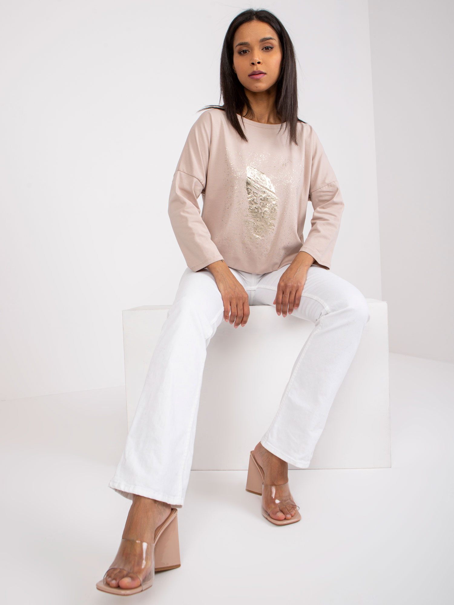Wymiary bluzki w rozmiarze S/M mierzone na płasko: szerokość pod pachami – 55 cm, długość całkowita – 60 cm, długość rękawa – 42 cm.
