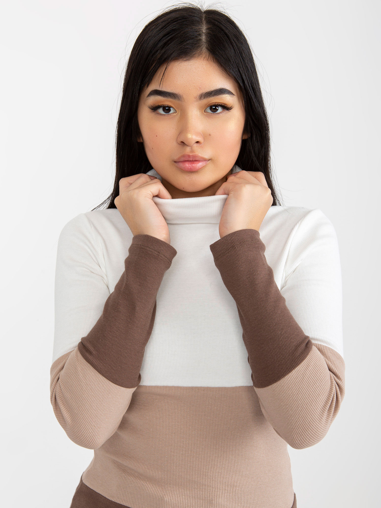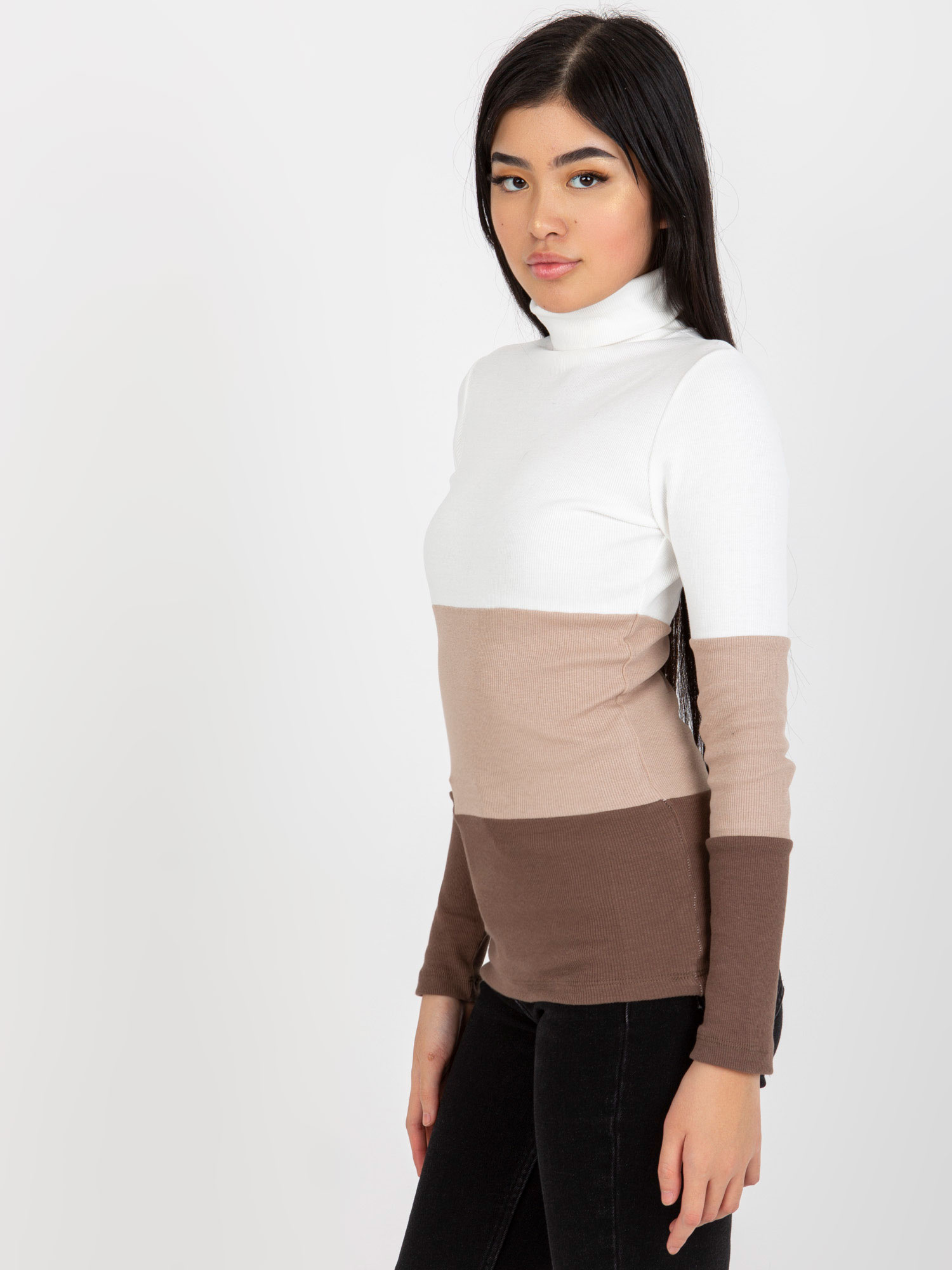 Ecru-brązowa bluzka basic z golfem w prążki .