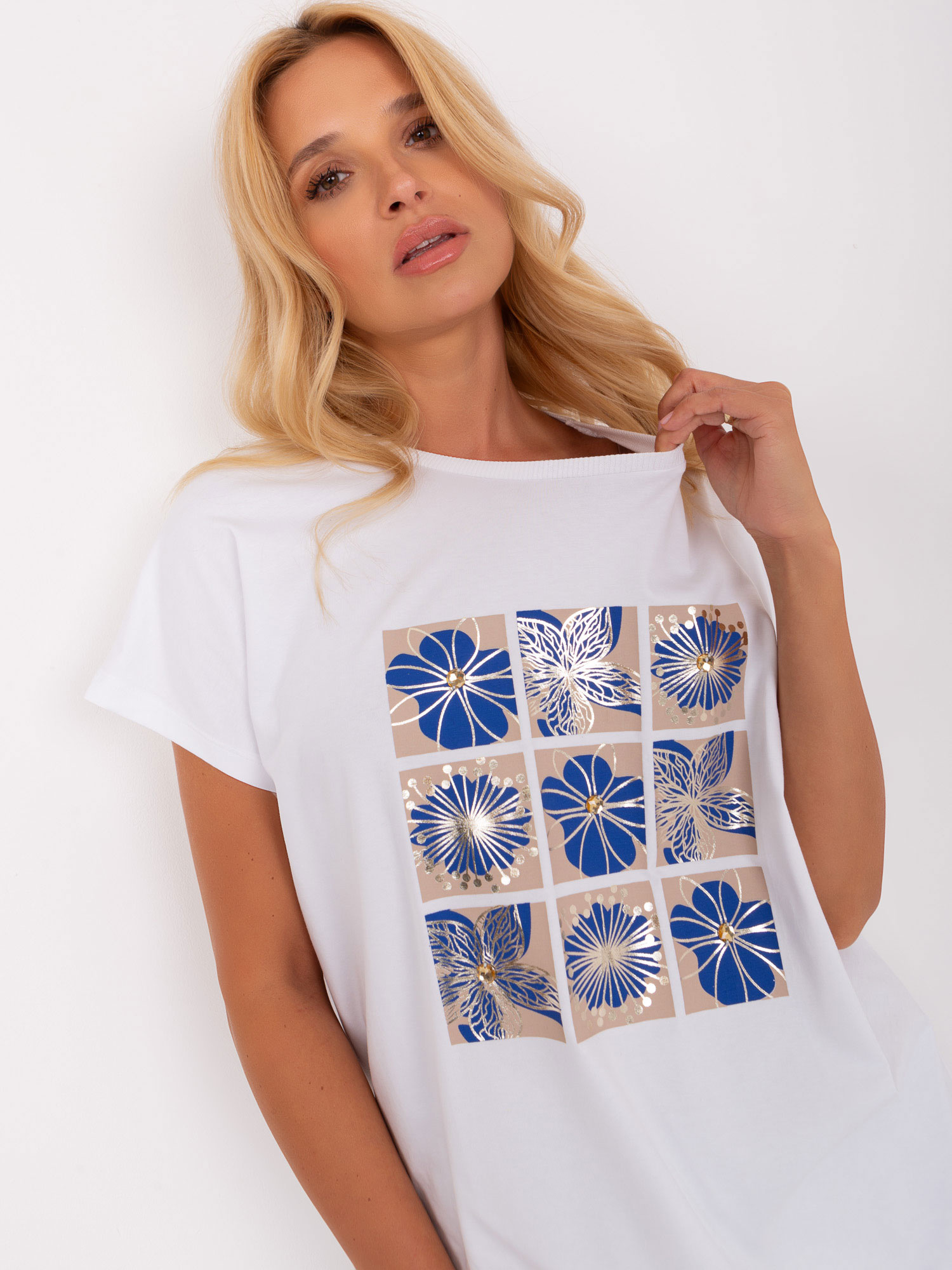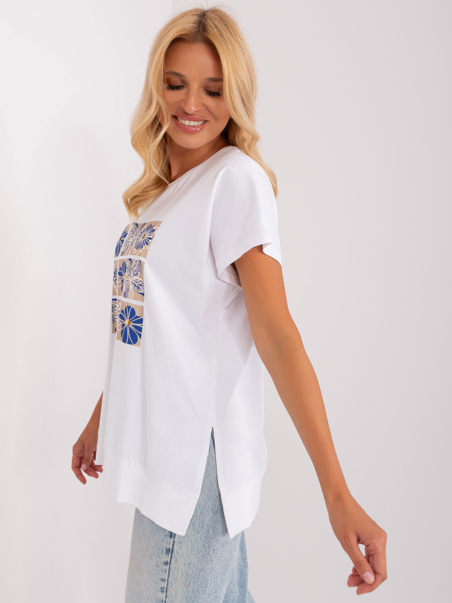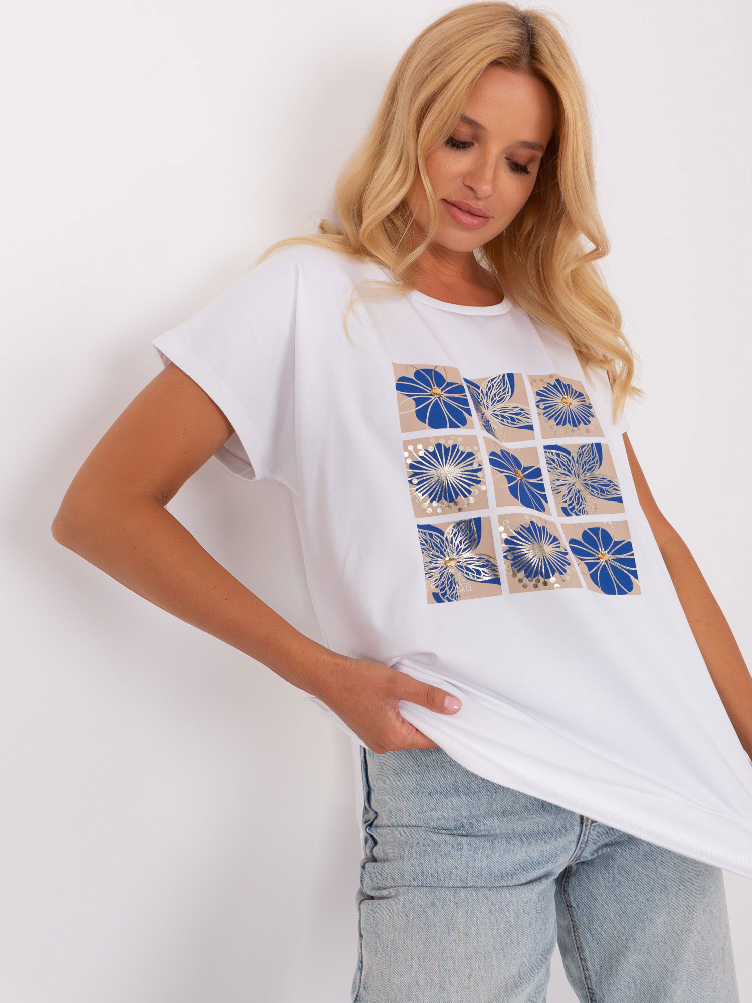 Biało-ciemnoniebieska damska bluzka z printem .