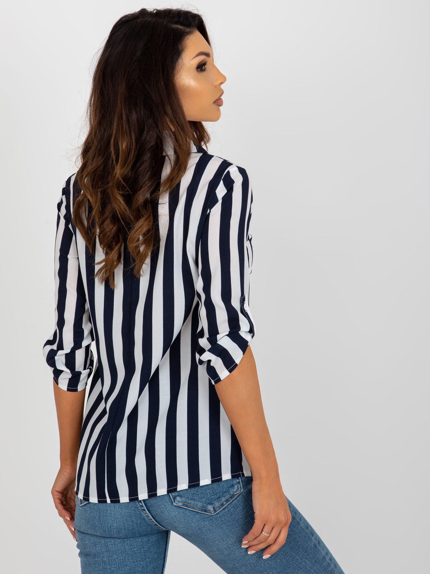 Granatowo-biała letnia bluzka koszulowa w paski .