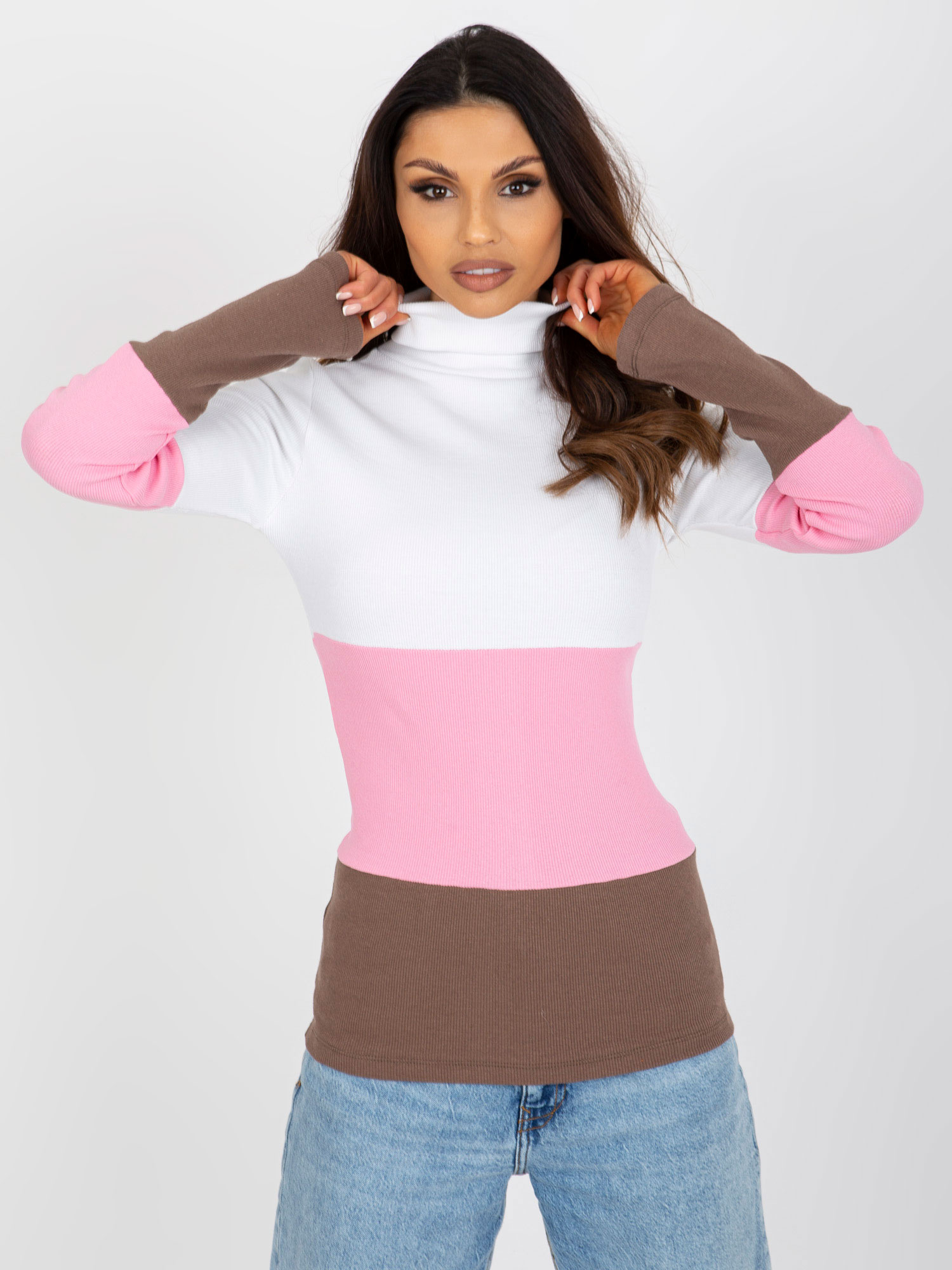 Ecru-różowa prążkowana bluzka basic z golfem .