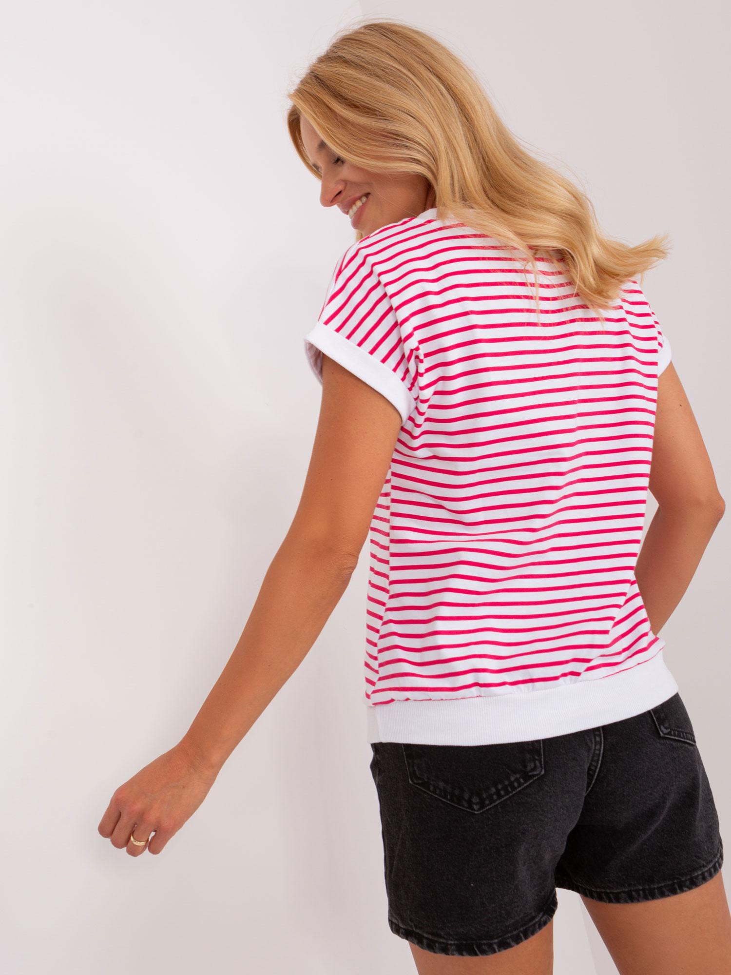 Biało-fuksjowa bluzka w paski z dekoltem V .