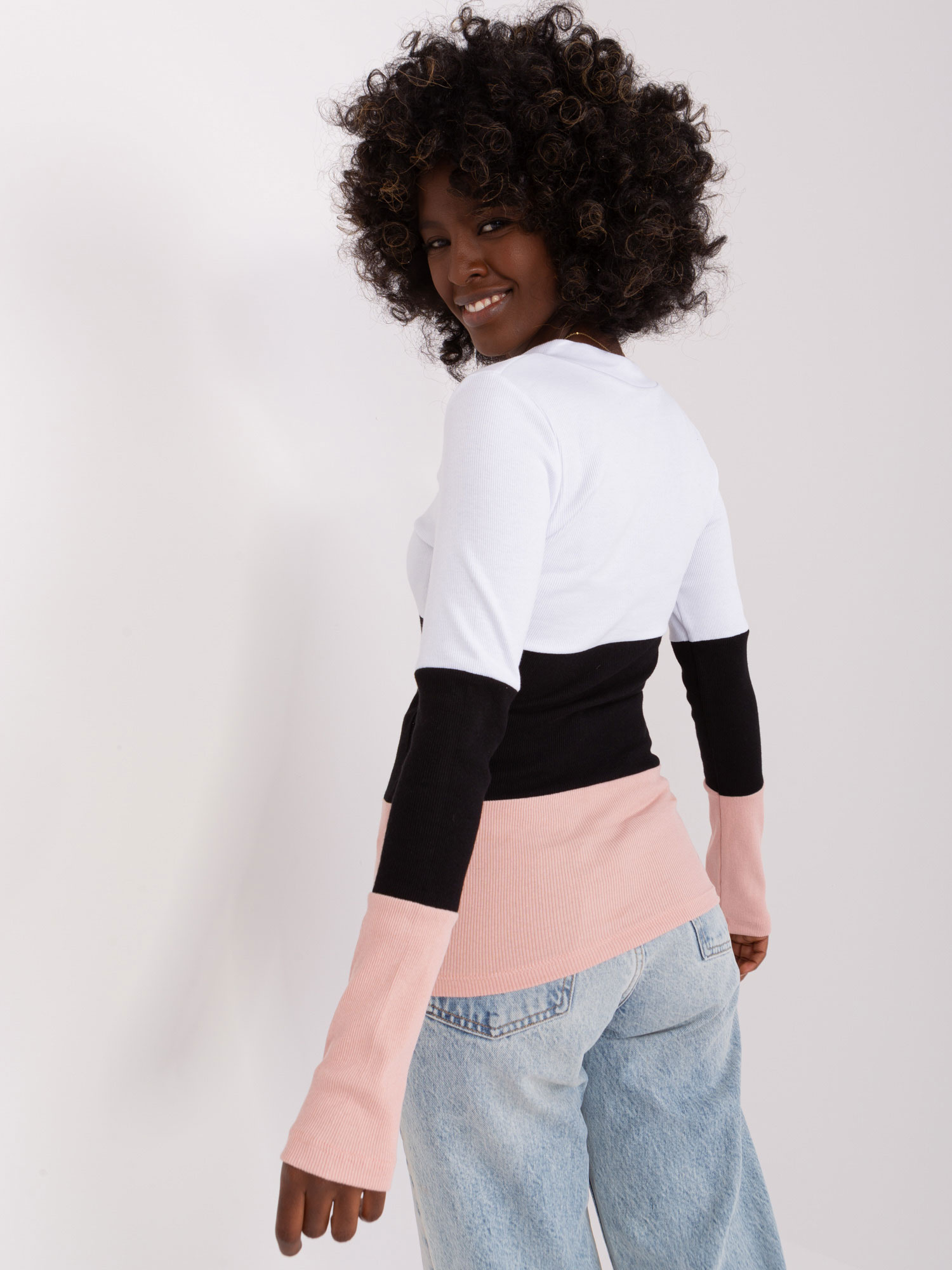 Biało-jasnoróżowa bluzka basic z długim rękawem .