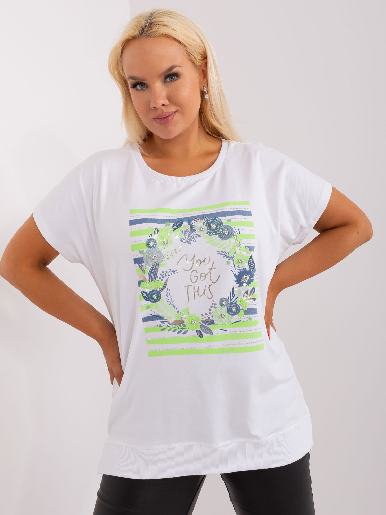 Biało-zielona bawełniana bluzka plus size z nadrukiem.