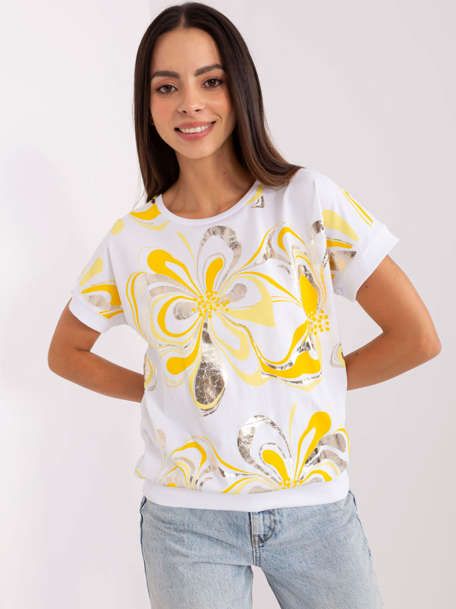 Biało-żółta bluzka z błyszczącym nadrukiem .
