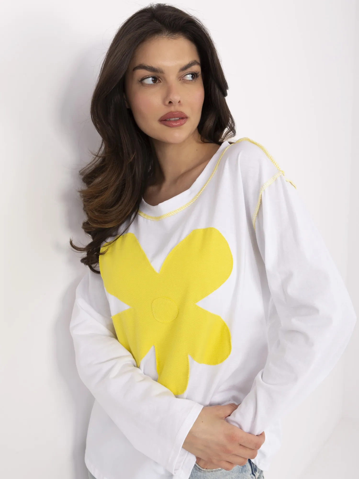 Wymiary bluzki w rozmiarze one size mierzone na płasko: szerokość pod pachami – 60 cm, długość rękawa – 55 cm (od szwu), szerokość w biodrach – 60 cm, długość całkowita – 67 cm.