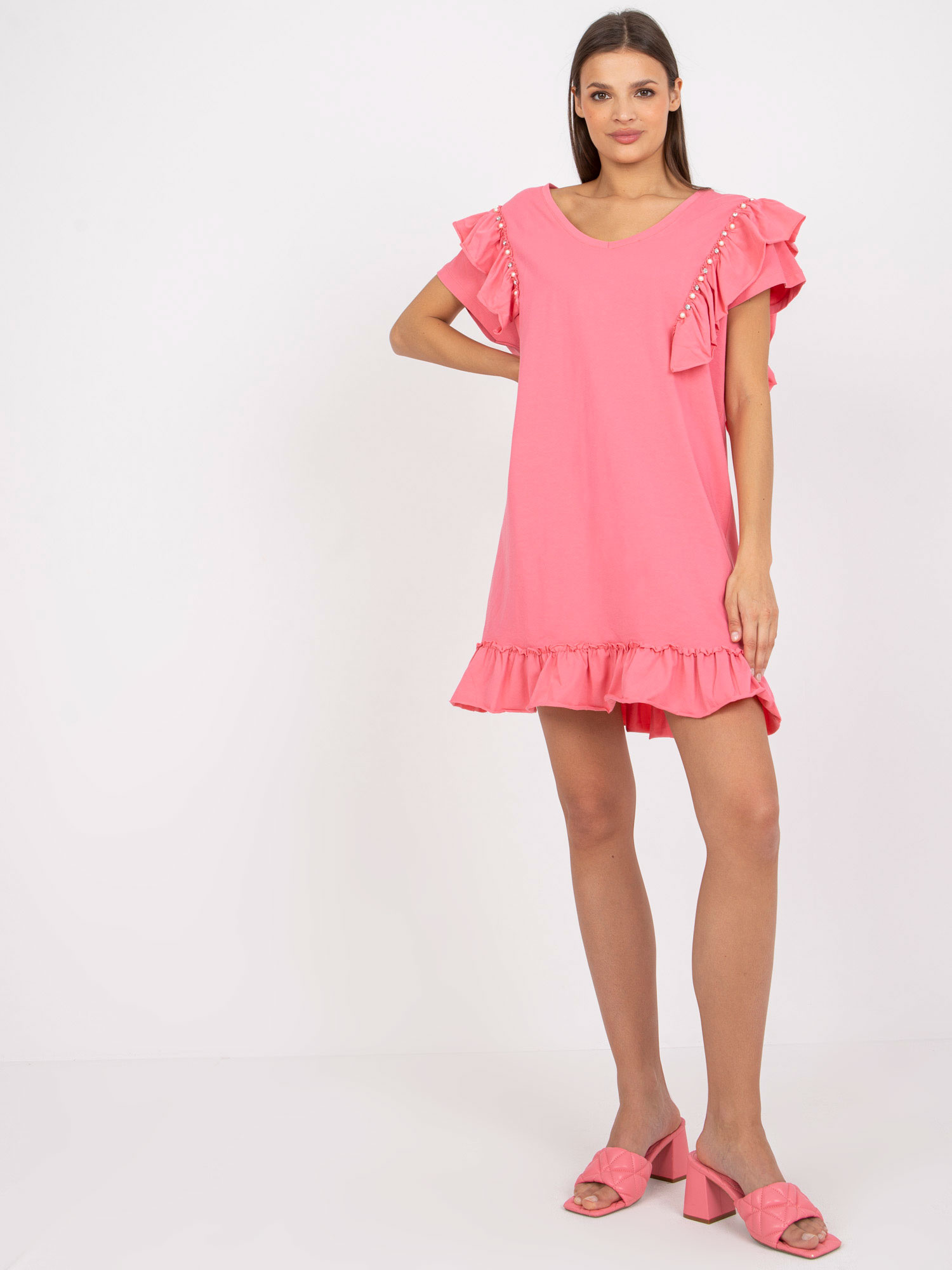 Modelka ma na sobie rozmiar one size. Wymiary modelki: wzrost 176 cm, biust 85 cm, talia 64 cm, biodra 92 cm.