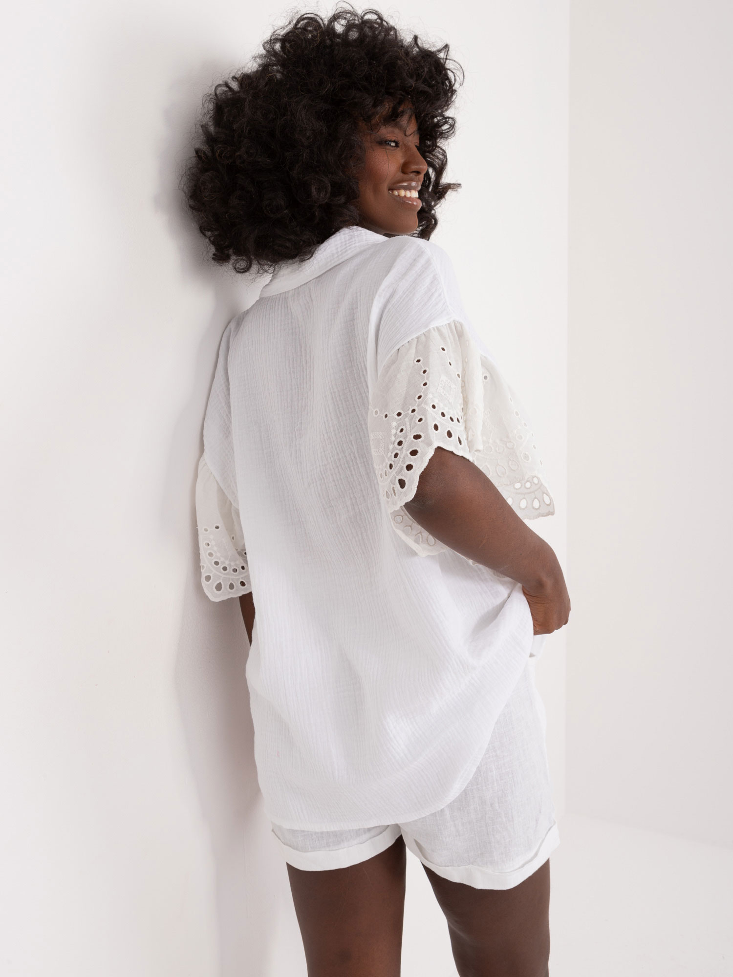 Wymiary bluzki w rozmiarze one size mierzone na płasko: szerokość pod pachami – 52 cm, długość całkowita – 67 cm