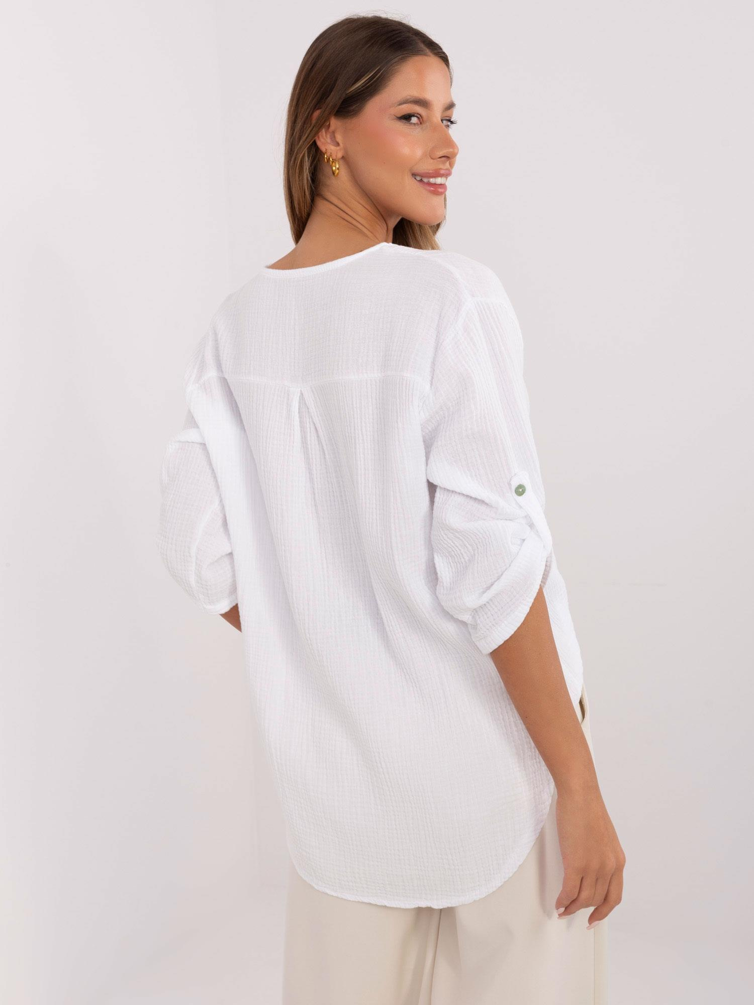 Wymiary bluzki w rozmiarze one size mierzone na płasko: szerokość pod pachami – 62 cm, długość rękawa – 45 cm (od szwu), szerokość w biodrach – 67 cm, długość całkowita – 69 cm (przód, długość całkowita – 80 cm (tył).